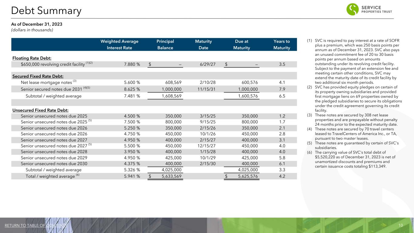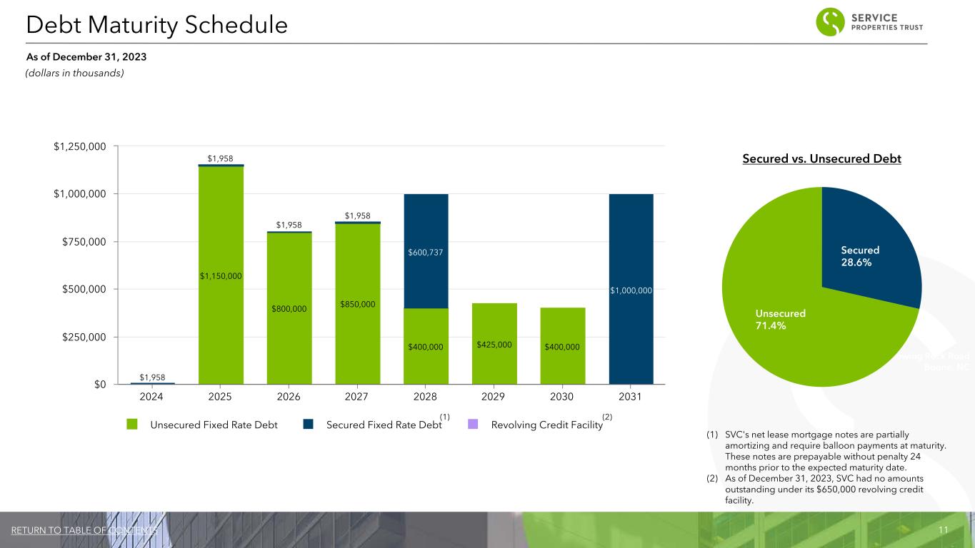 10返回目录(1)SVC需要按SOFR加溢价的利率支付利息,截至2023年12月31日,该利率为每年250个基点。SVC还根据其循环信贷额度下的未偿金额每年支付20至30个基点的未使用承诺费。在支付延期费并满足某些其他条件的情况下,SVC可以将其信贷额度的到期日再延长两个六个月期限。(2)SVC已为其若干拥有物业的附属公司提供股权质押,并为被质押的附属公司拥有的69处物业提供第一抵押留置权,以担保其在管辖其信贷融资的信贷协议项下的义务。(3)这些票据由308处净租赁物业作抵押,可在预期到期日前24个月免罚金提前偿还。(4)这些票据由根据两份主租约出租给America Inc.(TA)的TravelCenters的70个旅行中心提供担保。(5)这些票据由SVC的某些子公司提供担保。(6)SVC截至2023年12月31日的总债务5520,220美元的账面价值已扣除未摊销的折扣和溢价以及某些发行费用,总额为113,349美元。按年到期的加权平均本金期限至利率余额日到期日浮动利率债务:650,000美元循环信贷额度(1)(2)7.880% $ — 6/29/27 $ — 3.5有担保固定利率债务:净租赁抵押票据(3)5.600% 608,5692/10/28600,5764.12031年到期的优先有担保票据(4)(5)8.625% 1,000,00011/15/311,000,0007.9小计/加权平均7.481% 1,608,5691,600,5766.5无担保固定利率债务:2025年到期的优先无担保票据4.500% 350,0003/15/25350,0001.2 2025年到期的优先无担保票据(5)7.500% 800,0009/15/25800,0001.7 2026年到期的优先无担保票据5.250% 350,0002/15/26350,0002.1于2026年到期的高级无抵押票据4.750% 450,00010/1/26450,0002.8于2027年到期的高级无抵押票据4.950% 400,0002/15/27400,0003.1于2027年到期的高级无抵押票据(5)5.500% 450,00012/15/27450,0004.0于2028年到期的高级无抵押票据3.950% 400,0001/15/28400,0004.0于2029年到期的高级无抵押票据4.950% 425,00010/1/29425,0005.8于2030年到期的高级无抵押票据4.375% 400,0002/15/30400,0006.1小计/加权平均5.326% 4,025,0004,025,0003.3合计/加权平均(6)5.941% $ 5,633,569 $ 5,625,572023年(千美元)