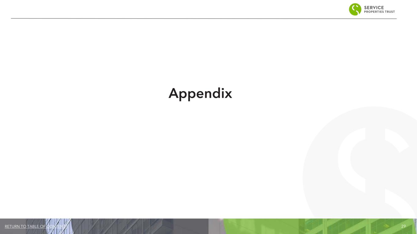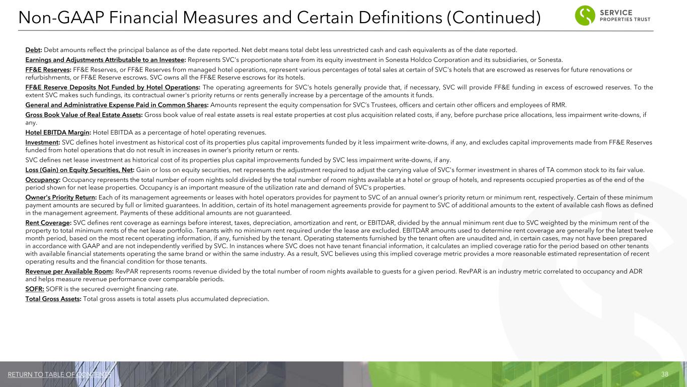 38RETURN to Table of Contents债务:债务金额反映截至报告日期的本金余额。净债务是指截至报告日期的总债务减去非限制性现金和现金等价物。归属于被投资方的收益和调整:代表SVC从其对Sonesta Holdco Corporation及其子公司或Sonesta的股权投资中获得的比例份额。FF & E储备金:FF & E储备金,或来自托管酒店运营的FF & E储备金,代表SVC某些酒店总销售额的不同百分比,这些酒店作为未来翻新或翻新的储备金或FF & E储备金代管。SVC拥有其酒店的所有FF & E Reserve代管。FF & E准备金存款不由酒店运营提供资金:SVC旗下酒店的运营协议一般规定,如有必要,SVC将提供超过托管准备金的FF & E资金。就SVC提供此类资金而言,其合同所有者的优先回报或租金通常会增加其资助金额的一个百分比。以普通股支付的一般和管理费用:金额代表SVC的受托人、高级职员以及RMR的某些其他高级职员和雇员的股权补偿。房地产资产的账面总值:房地产资产的账面总值是按成本加上购置相关成本(如有)在购买价格分配前减去减值减记(如有)的房地产物业。酒店EBITDA利润率:酒店EBITDA占酒店营业收入的百分比。投资:SVC将酒店投资定义为其物业的历史成本加上由其资助的资本改进减去减值(如果有的话),并且不包括由酒店运营资助的FF & E储备进行的资本改进,这些改进不会导致所有者的优先回报或租金增加。SVC将净租赁投资定义为其物业的历史成本加上由SVC资助的资本改善减去减值减记(如果有的话)。权益证券损失(收益),净额:权益证券的收益或损失,净额表示将SVC以前投资于TA普通股股票的账面价值调整为其公允价值所需的调整。入住率:入住率是指已售出的间夜总数除以一家酒店或一组酒店的可用间夜总数,并代表截至净租赁物业所示期间结束时的已占用物业。入住率是衡量SVC物业利用率和需求量的重要指标。业主优先回报:其与酒店运营商的每项管理协议或租约分别规定向SVC支付年度业主优先回报或最低租金。其中某些最低付款金额由全额或有限担保担保。此外,其某些酒店管理协议规定在管理协议中定义的可用现金流量范围内向SVC支付额外金额。这些额外金额的支付不受保证。租金覆盖率:SVC将租金覆盖率定义为扣除利息、税项、折旧、摊销和租金前的收益,或EBITDA,除以SVC的年度最低租金加权后的物业最低租金到净租赁组合的总最低租金。不包括租约规定的无最低租金的租户。用于确定租金覆盖范围的EBITDA金额通常是最近十二个月期间的,基于租户提供的最新运营信息(如果有的话)。租户提供的经营报表通常未经审计,在某些情况下,可能不是按照公认会计原则编制的,也不是由SVC独立核实的。在SVC没有租户财务信息的情况下,它会根据经营同一品牌或同一行业内可获得财务报表的其他租户计算该期间的隐含覆盖率。因此,SVC认为,使用这一隐含覆盖率指标可以更合理地估计近期经营业绩和这些租户的财务状况。每间可用客房的收入:RevPAR是指客房收入除以特定时期内可供客人使用的间夜总数。RevPAR是与入住率和ADR相关的行业指标,有助于衡量可比期间的收入表现。SOFR:SOFR为有担保隔夜融资利率。总资产:总资产是总资产加上累计折旧。非GAAP财务指标和某些定义(续)