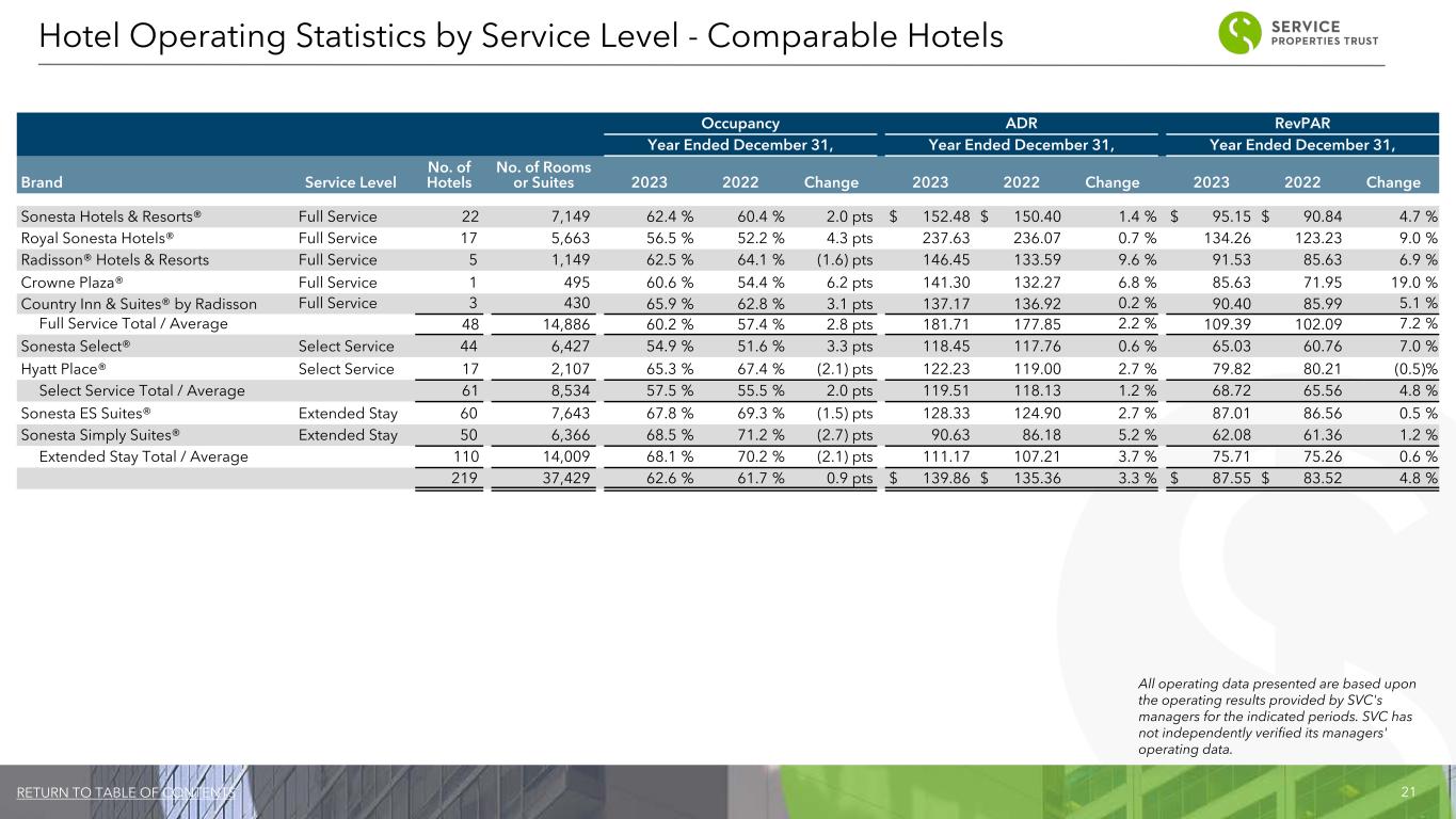 20截至12月31日止三个月、截至12月31日止三个月、截至12月31日止三个月、截至12月31日止三个月、品牌服务水平酒店数量房间数量OR Suites 20232022 Change 20232022 Change 20232022 Change Sonesta Hotels & Resorts ® Full Service 227,14956.6% 58.6%(2.0)pts $ 147.22 $ 143.90 2.3% $ 83.33 $ 84.33(1.2)% Royal Sonesta Hotels ® Full Service 175,66353.0% 51.3% 1.7 pts 234.48 235.75(0.5)% 124.27 120.94 2.8% Radisson ® Hotels & Resorts Full Service 51,14955.6% 63.0%(7.4)pts 138.71 129.80 6.9% 77.12 81.77(5.7)% Crowne Plaza ® Full Service 149552.2% 53.8%(1.6)pts 142.45 137.10 3.9% 74.3673.76 0.8%丽笙Country Inn & Suites ® by Radisson Full Service 343056.5% 55.1% 1.4 pts 127.43 131.31(3.0)% 72.0072.35(0.5)% Full Service Total/Average 4814,88655.0% 55.8%(0.8)pts 177.76 174.48 1.9% 97.77 97.36 0.4% Sonesta Select ® Select Service 446,42751.2% 50.2% 1.0 pts 114.36 115.17(0.7)% 58.5557.82 1.3% Hyatt Place ® Select Service 172,1075 2.5% 65.1%(12.6)pts 114.59 119.04(3.7)% 60.16 77.50(22.4)% Select Service Total/Average 618,53451.5% 53.8%(2.3)pts 114.42116.33(1.6)% 58.9362.59(5.8)% Sonesta ES Suites ® Extended Stay 607,64363.7% 65.1%(1.4)pts 123.94 126.84(2.3)% 78.958 2.57(4.4)% Sonesta Simply Suites ® Extended Stay 506,366663.8% 66.5%(2.7)pts 90.58 90.15 0.5% 57.7 959.95(3.6)% Extended Stay合计/平均11014,00963.7% 65.7%(2.0)pts 108.77 110.09(1.2)% 69.2972.33(4.2)% 21937,42957.5% 59.1%(1.6)pts $ 136.18 $ 135.50 0.5% $ 78.30 $ 80.08(2.2)%按服务水平划分的酒店运营统计-可比酒店所提供的所有运营数据均基于SVC的管理人员提供的所示期间的运营结果。SVC没有独立核实其管理人的经营数据。