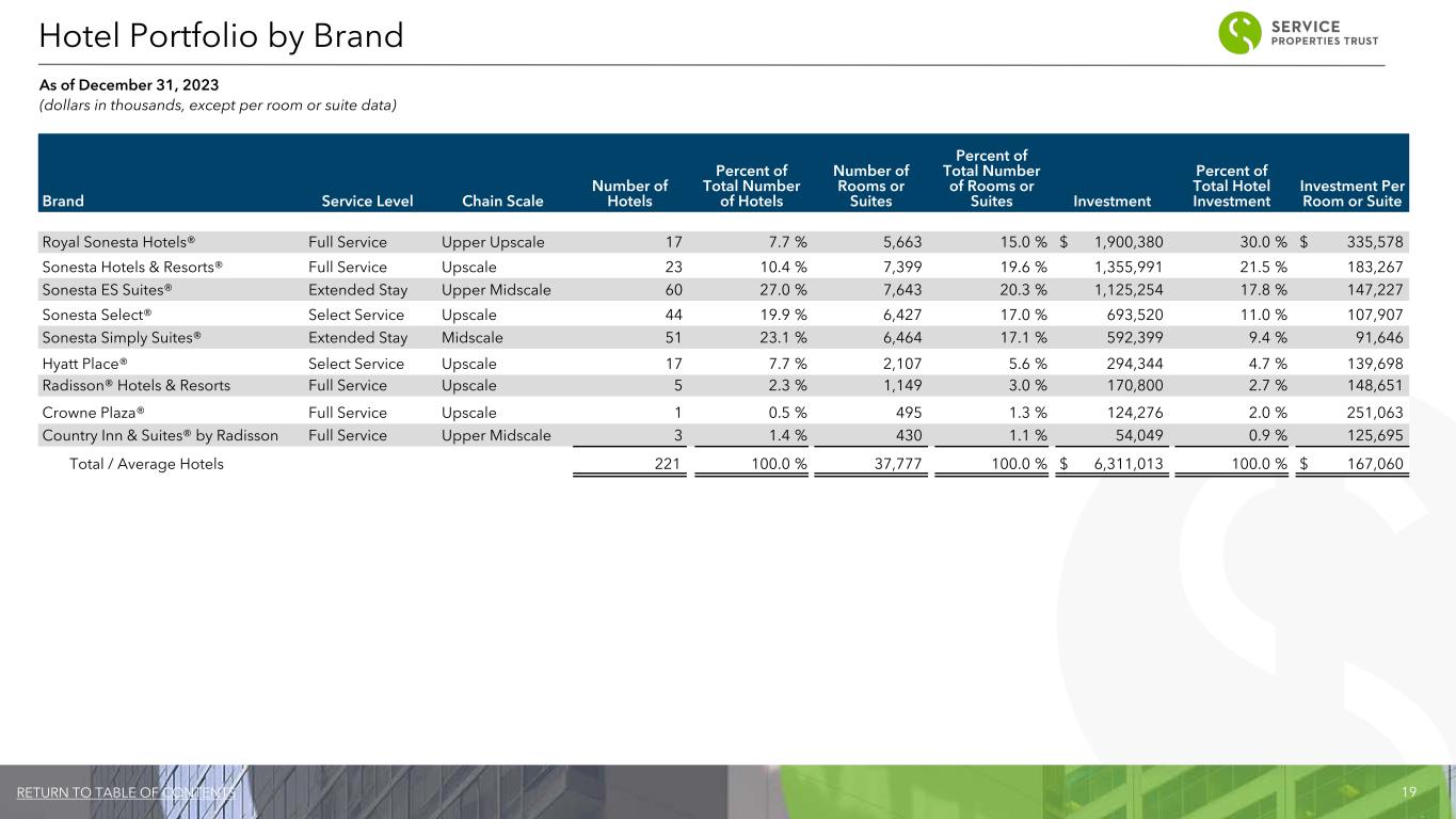 19返回目录品牌服务水平连锁规模酒店数量占酒店总数百分比房间或套房数量占房间或套房总数量百分比投资占酒店总投资投资百分比每间客房Or Suite Royal Sonesta Hotels ® Full Service Upper Upscale 177.7% 5,66315.0% $ 1,900,38030.0% $ 335,578 Sonesta Hotels & Resorts ® Full Service Upscale 2310.4% 7,39919.6% 1,355,99121.5% 183,267 Sonesta ES Suites ® Extended Stay Upper Midscale 6027.0% 7,64320.3% 1,125,25417.8% 147,227 Sonesta Select ® Select Service Upscale 4419.9% 6,42717.0% 693,5201.0% 107,907 Sonesta Simply Suites ® Extended Stay Midscale 5123.1% 6,46417.1% 592,3999.4% 91,646 Hyatt Place ® Select Service Upscale 17139,698 Radisson ® Hotels & Resorts全套服务高档52.3% 1,1493.0% 170,8002.7% 148,651 Crowne Plaza ®全套服务高档10.5% 4951.3% 124,2762.0% 251,063 Country Inn & Suites ® by Radisson全套服务中高档31.4% 4301.1% 54,0490.9% 125,695 Total/average hotels 221100.0% 37,777100.0% $ 6,311,013100.0% $ 167,060截至2023年12月31日按品牌划分的酒店组合(以千美元计,每间客房或套房数据除外)