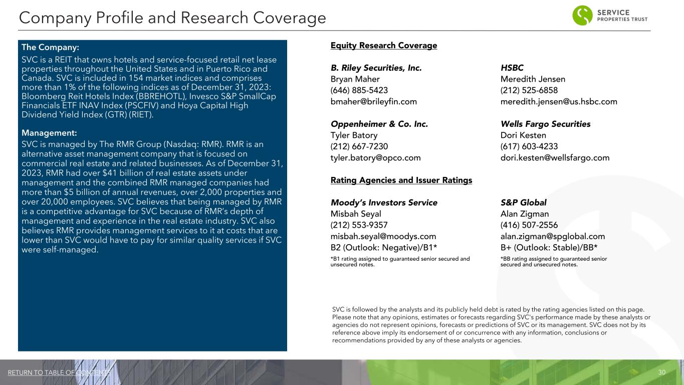 30返回目录公司简介和研究覆盖范围公司:SVC是一家房地产投资信托基金,在美国各地以及波多黎各和加拿大拥有酒店和以服务为重点的零售净租赁物业。SVC被纳入154个市场指数,截至2023年12月31日,其在以下指数中的占比超过1%:彭博REIT酒店指数(BBREHOTL)、景顺标普 SmallCap Financials ETF INAV Index(PSCFIV)和Hoya Capital High Dividend Yield Index(GTR)(RIET)。管理层:SVC由The RMR Group(纳斯达克:RMR)管理。RMR是一家专注于商业地产及相关业务的另类资产管理公司。截至2023年12月31日,RMR管理着超过410亿美元的房地产资产,RMR管理的公司合并后的年收入超过50亿美元,拥有超过2,000处房产和超过20,000名员工。上实发展认为,由于RMR在房地产行业的管理深度和经验,由RMR管理是上实发展的竞争优势。SVC还认为,RMR向其提供管理服务的成本低于如果SVC是自我管理的,SVC将不得不为类似的质量服务支付的成本。股票研究覆盖范围B. Riley Securities,Inc. HSBC Bryan Maher Meredith Jensen(646)885-5423(212)525-6858 bmaher@brileyfin.com meredith.jensen@us.hsbc.com Oppenheimer & Co. Inc. 富国银行 Securities Tyler Batory Dori Kesten(212)667-7230(617)603-4233 tyler.batory@opco.com dori.kesten@wellsfargo.com评级机构和发行人评级穆迪投资者服务公司标普全球 Misbah Seyal Alan Zigman(212)553-9357(416)507-2556 misbah.seyal@moodys.com alan.zigman @ spglobglobglobglob*授予有担保优先有担保和无担保票据BB评级。SVC由分析师跟踪,其公开持有的债务由本页列出的评级机构评级。请注意,这些分析师或机构就SVC的业绩作出的任何意见、估计或预测并不代表SVC或其管理层的意见、预测或预测。SVC的上述提及并不意味着其认可或同意任何这些分析师或机构提供的任何信息、结论或建议。