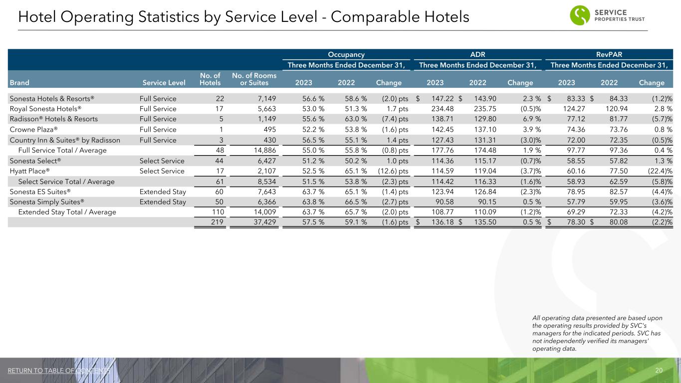 22RETURN to Table of Contents Occupancy ADR RevPAR截至12月31日止三个月、截至12月31日止三个月、截至12月31日止三个月、品牌服务水平酒店数量房间数量OR Suites 20232022 Change 20232022 Change 20232022 Change Sonesta Hotels & Resorts ® Full Service 237,39957.0% 58.5%(1.5)pts $ 152.57 $ 150.66 1.3% $ 86.96 $ 88.14(1.3)% Royal Sonesta Hotels ® Full Service 175,66353.0% 51.3% 1.7 pts 234.48 235.75(0.5)% 124.27 120.94 2.8% Radisson ® Hotels & Resorts Full Service 51,14955.6% 63.0%(7.4)pts 138.71 129.80 6.9% 77.12 81.77(5.7)% Crowne Plaza ® Full Service 149552.2% 53.8%(1.6)pts 142.45 137.10 3.9% 74.3673.76 0.8%丽笙Country Inn & Suites ® by Radisson Full Service 343056.5% 55.1% 1.4 pts 127.43 131.31(3.0)% 72.0072.35(0.5)% Full Service Total/Average 4915,13655.2% 55.8%(0.6)pts 179.85 177.40 1.4% 99.28 98.99 0.3% Sonesta Select ® Select Service 446,42751.2% 50.2% 1.0 pts 114.36 115.17(0.7)% 58.5557.82 1.3% Hyatt Place ® Select Service 172,1075 2.5% 65.1%(12.6)pts 114.59 119.04(3.7)% 60.16 77.50(22.4)% Select Service Total/Average 618,53451.5% 53.8%(2.3)pts 114.42116.33(1.6)% 58.9362.59(5.8)% Sonesta ES Suites ® Extended Stay 607,64363.7% 65.1%(1.4)pts 123.94 126.84(2.3)% 78.958 2.57(4.4)% Sonesta Simply Suites ® Extended Stay 516,46463.2% 65.9%(2.7)pts 90.58 90.15 0.5% 57.2559.41(3.6)% Extended Stay合计/平均11114,10763.4% 65.4%(2.0)pts 108.77 110.09(1.2)% 68.96 72.00(4.2)% 22137,77757.4% 59.0%(1.6)pts $ 137.31 $ 136.84 0.3% $ 78.82 $ 80.74(2.4)%按服务水平划分的酒店运营统计-所有酒店(1)所提供的所有运营数据均基于SVC的管理人员提供的所示期间的运营结果。SVC没有独立核实其管理人的经营数据。(1)包括截至2023年12月31日拥有的所有酒店的业绩。