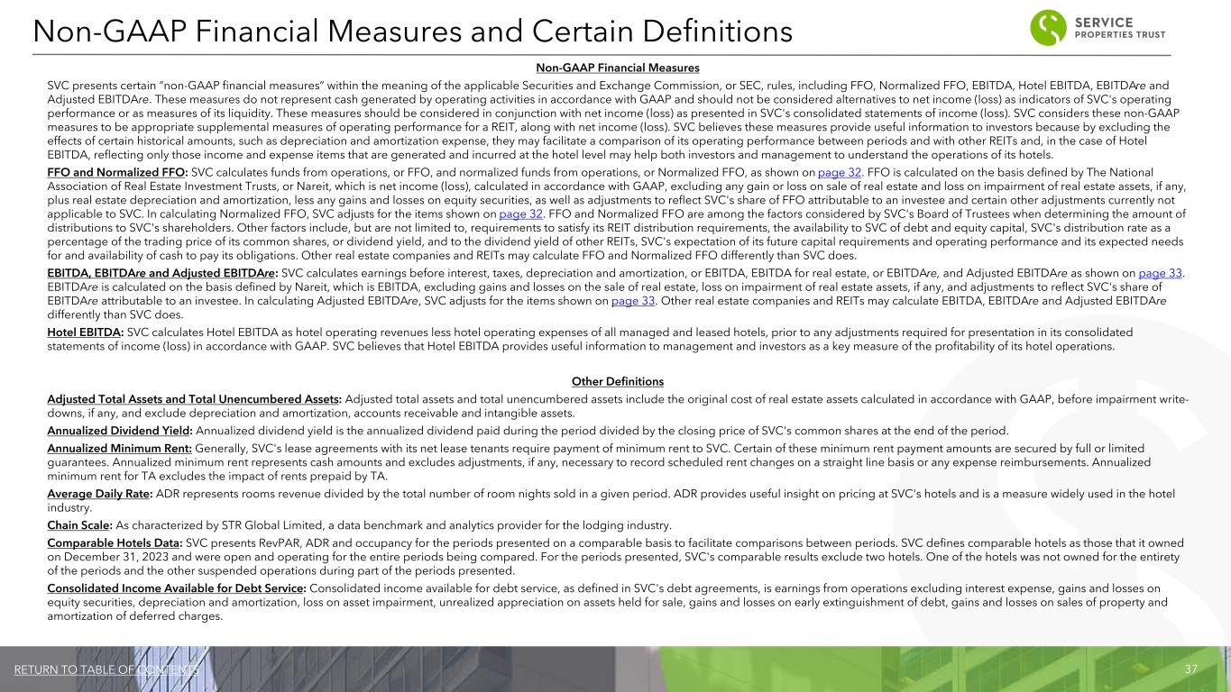 37返回目录非GAAP财务指标SVC提出了适用的证券交易委员会(SEC)规则含义内的某些“非GAAP财务指标”,包括FFO、标准化FFO、EBITDA、酒店EBITDA、EBITDA和调整后EBITDA。这些衡量标准并不代表根据公认会计原则经营活动产生的现金,不应被视为替代净收入(亏损)作为SVC经营业绩的指标或流动性的衡量标准。这些措施应与SVC综合收益(亏损)报表中列报的净收益(亏损)一并考虑。SVC认为这些非GAAP衡量标准是REIT经营业绩的适当补充衡量标准,此外还有净收入(亏损)。SVC认为,这些措施为投资者提供了有用的信息,因为通过排除某些历史金额的影响,例如折旧和摊销费用,它们可能有助于比较其不同时期的经营业绩以及与其他REITs的经营业绩,就酒店EBITDA而言,仅反映在酒店层面产生和发生的那些收入和支出项目可能有助于投资者和管理层了解其酒店的经营情况。FFO和标准化FFO:SVC计算来自运营的资金,或FFO,以及来自运营的标准化资金,或标准化FFO,如第32页所示。FFO是根据美国全国房地产投资信托协会(National Association of Real Estate Investment Trusts)或Nareit定义的基础计算的,这是根据GAAP计算的净收入(亏损),不包括出售房地产的任何损益和房地产资产减值损失(如果有的话),加上房地产折旧和摊销,减去股本证券的任何损益,以及反映SVC应占被投资方FFO份额的调整以及目前不适用于SVC的某些其他调整。在计算归一化FFO时,SVC会针对第32页所示的项目进行调整。FFO和标准化FFO是SVC董事会在确定向SVC股东的分配金额时考虑的因素之一。其他因素包括但不限于满足其REIT分配要求的要求、向SVC提供债务和股权资本的情况、SVC的分配率占其普通股交易价格的百分比或股息收益率,以及其他REIT的股息收益率、SVC对其未来资本需求和经营业绩的预期以及其支付其义务的现金的预期需求和可用性。其他房地产公司和REITs计算FFO和标准化FFO的方式可能与SVC不同。EBITDA、EBITDA和调整后EBITDA:SVC计算未计利息、税项、折旧和摊销前利润,或EBITDA、房地产EBITDA或EBITDA,以及调整后EBITDA,如第33页所示。EBITDA是根据Nareit定义的基础计算的,这是EBITDA,不包括出售房地产的损益、房地产资产减值损失(如果有的话)以及为反映SVC在归属于被投资方的EBITDA中所占份额而进行的调整。在计算调整后的EBITDA时,SVC对第33页所示项目进行了调整。其他房地产公司和REITs计算EBITDA、EBITDA和调整后EBITDA的方式可能与SVC不同。酒店EBITDA:SVC将酒店EBITDA计算为酒店运营收入减去所有管理和租赁酒店的酒店运营费用,然后根据公认会计原则在其综合损益表中列报所需的任何调整。SVC认为,酒店EBITDA为管理层和投资者提供了有用的信息,作为衡量其酒店运营盈利能力的关键指标。其他定义调整后的总资产和未设押资产总额:调整后的总资产和未设押资产总额包括根据公认会计原则计算的不动产资产的原始成本,如有减值减记前,不包括折旧和摊销、应收账款和无形资产。年化股息收益率:年化股息收益率为期间支付的年化股息除以SVC普通股期末收盘价。年化最低租金:通常,SVC与其净租赁租户的租赁协议要求向SVC支付最低租金。其中某些最低租金支付金额由全额或有限担保担保。年化最低租金代表现金金额,不包括任何调整, 必须以直线方式记录预定的租金变化或任何费用报销。TA年化最低租金剔除TA预付租金影响。平均每日房价:ADR表示客房收入除以在特定时期内售出的总间夜数。ADR为SVC旗下酒店的定价提供了有用的洞察力,是酒店行业广泛使用的一种衡量标准。连锁规模:以STR Global Limited为特征,为住宿行业的数据基准和分析提供商。可比酒店数据:SVC在可比基础上列报期间的RevPAR、ADR和入住率,以便于期间之间的比较。SVC将可比酒店定义为其在2023年12月31日拥有并在整个被比较期间营业和运营的酒店。在所述期间,SVC的可比结果不包括两家酒店。其中一家酒店在整个期间内均未拥有,另一家酒店则在所述期间的部分期间内暂停运营。可用于偿债的合并收入:根据SVC债务协议的定义,可用于偿债的合并收入是经营收益,不包括利息费用、股本证券损益、折旧和摊销、资产减值损失、持有待售资产的未实现增值、债务提前清偿的损益、出售财产的损益和递延费用的摊销。非GAAP财务指标和某些定义