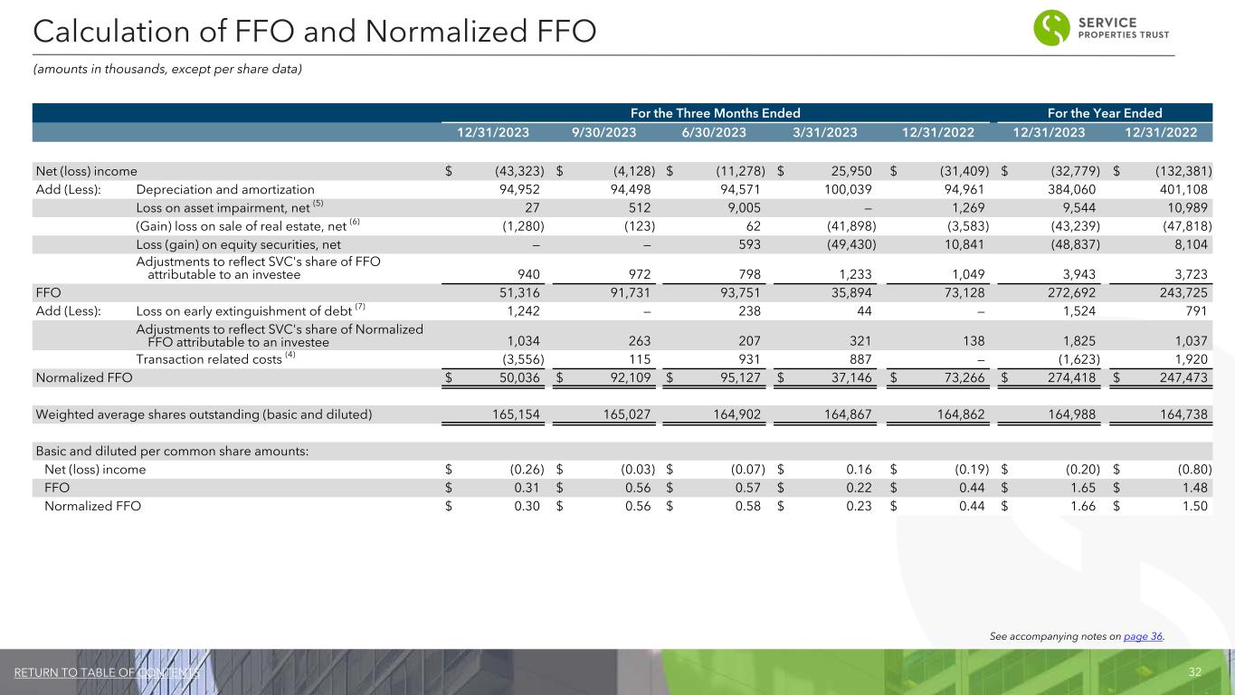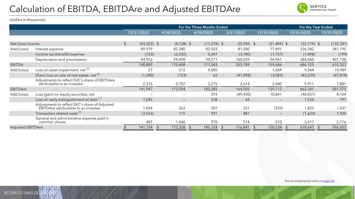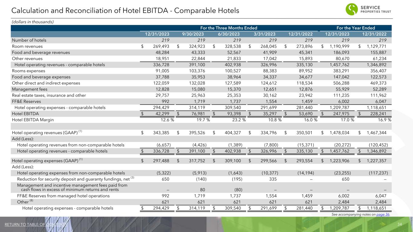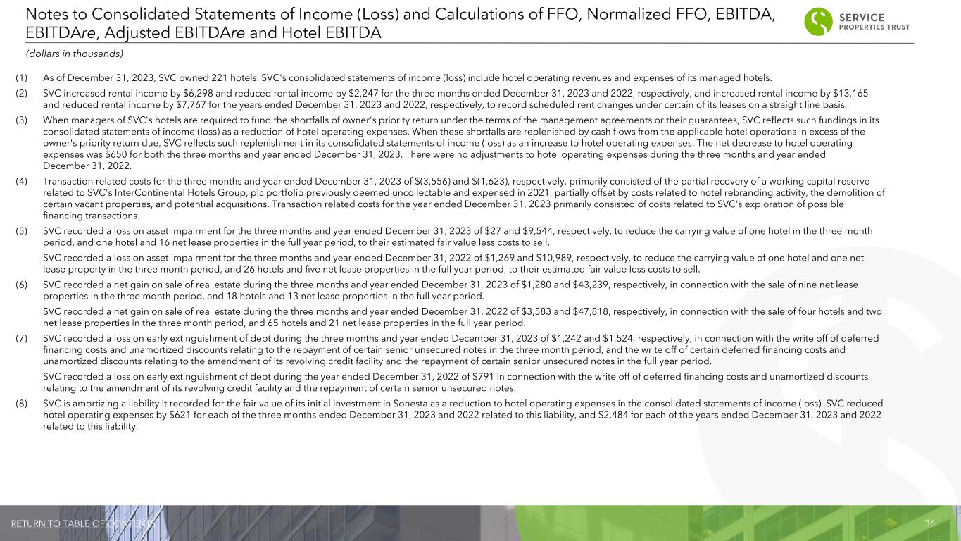 36返回目录附注合并损益表及FFO、正常化FFO、EBITDA、EBITDA、调整后EBITDA和酒店EBITDA的计算(千美元)(1)截至2023年12月31日,SVC拥有221家酒店。SVC的综合收益(亏损)报表包括其管理的酒店的酒店运营收入和费用。(2)SVC截至2023年12月31日和2022年12月31日止三个月的租金收入分别增加6,298美元和减少2,247美元,截至2023年12月31日和2022年12月31日止年度的租金收入分别增加13,165美元和减少7,767美元,以直线记录其某些租约下的预定租金变化。(3)当SVC旗下酒店的管理人被要求根据管理协议或其担保的条款为所有者优先回报的不足提供资金时,SVC在其综合损益表中将此类资金反映为酒店运营费用的减少。当这些短缺由适用的酒店运营产生的现金流量补充超过所有者到期的优先回报时,SVC在其综合损益表中将此种补充反映为酒店运营费用的增加。截至2023年12月31日的三个月和一年,酒店运营费用净减少650美元。截至二零二二年十二月三十一日止三个月及年度,酒店经营开支并无调整。(4)截至2023年12月31日止三个月和年度的交易相关成本分别为(3,556)美元和(1,623)美元,主要包括部分收回与SVC旗下洲际酒店集团(InterContinental Hotels Group,PLC)投资组合相关的营运资本储备,该投资组合此前被认为无法收回并在2021年计入费用,部分被与酒店品牌重塑活动、拆除某些空置物业以及潜在收购相关的成本所抵消。截至2023年12月31日止年度的交易相关成本主要包括与SVC探索可能的融资交易相关的成本。(5)SVC于截至2023年12月31日止三个月及年度分别录得资产减值亏损27美元及9,544美元,以将三个月期间的一间酒店及全年期间的一间酒店及16间净租赁物业的账面价值减至其估计公允价值减销售成本。SVC于截至2022年12月31日止三个月及年度分别录得资产减值亏损1,269美元及10,989美元,以将三个月期间的一间酒店及一间净租赁物业的账面价值,以及全年期间的26间酒店及五间净租赁物业的账面价值减至其估计公允价值减销售成本。(6)SVC于截至2023年12月31日止三个月及年内分别录得出售房地产净收益1280美元及43239美元,与三个月期间出售九个净租赁物业有关,以及全年出售18个酒店及13个净租赁物业有关。SVC在截至2022年12月31日的三个月和年内分别录得出售房地产的净收益3583美元和47818美元,与三个月期间出售四家酒店和两处净租赁物业有关,以及全年期间出售65家酒店和21处净租赁物业有关。(7)SVC于截至2023年12月31日止三个月及年度分别录得债务提前清偿亏损1,242美元及1,524美元,与注销与在三个月期间偿还若干优先无抵押票据有关的递延融资成本及未摊销折扣,以及注销与修订其循环信贷融资额度及在全年期间偿还若干优先无抵押票据有关的若干递延融资成本及未摊销折扣有关。SVC在截至2022年12月31日止年度录得791美元的提前清偿债务损失,这与注销与修订其循环信贷额度和偿还某些高级无抵押票据有关的递延融资成本和未摊销折扣有关。(8)SVC正在摊销其在Sonesta的初始投资的公允价值记录的一项负债,作为综合损益表中酒店运营费用的减少。SVC在截至2023年12月31日和2022年12月31日的三个月中,与该负债相关的酒店运营费用各减少了621美元,在截至2023年12月31日和2022年12月31日的各年中,与该负债相关的酒店运营费用各减少了2484美元。