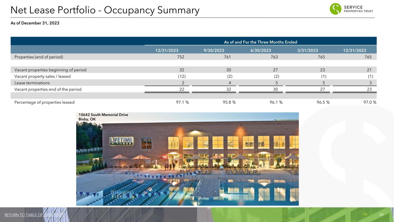 28截至12/31/20239/30/20236/30/20233/31/202312/31/2022物业(期末)752761763765765期初空置物业3230272321空置物业销售/出租(12)(2)(2)(1)(1)租赁终止24553期末空置物业2232302723租赁物业百分比97.1% 95.8% 96.1% 96.5% 97.0%净租赁组合-截至2023年12月31日的入住率摘要10642 South Memorial Drive Bixby,OK