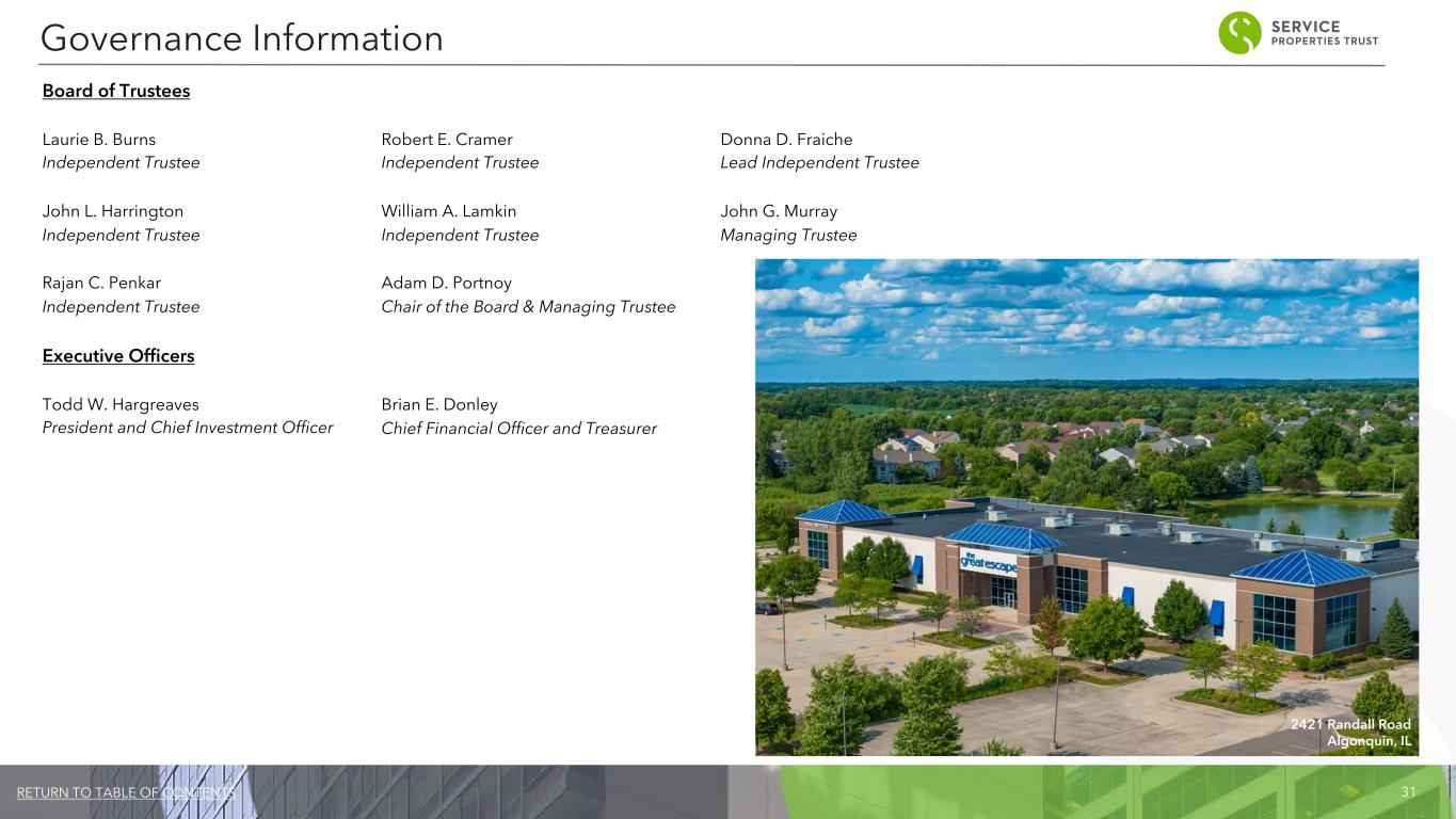 31日重回目录董事会Laurie B. Burns Robert E. Cramer Donna D. Fraiche独立受托人独立受托人首席独立受托人丨John L. Harrington 丨John G. MurrayTERM3独立受托人独立受托人管理受托人TERM0 Rajan C. Penkar Rajan C. PenkarTERM4Adam D. Portnoy独立受托人董事会主席兼管理受托人执行官Todd W. Hargreaves Brian E. Donley总裁兼首席投资官首席财务官和财务主管治理信息2421 Randall Road Algonquin,IL