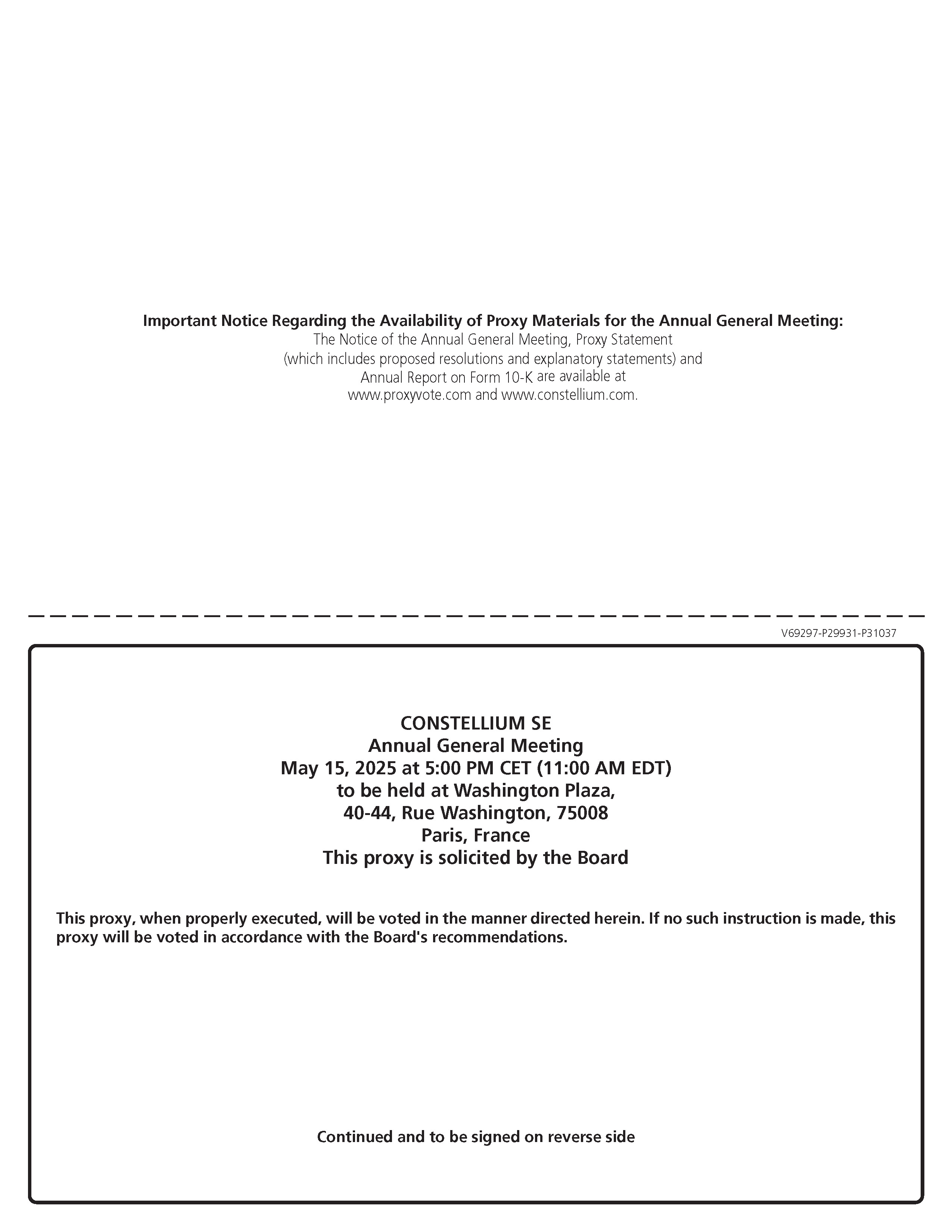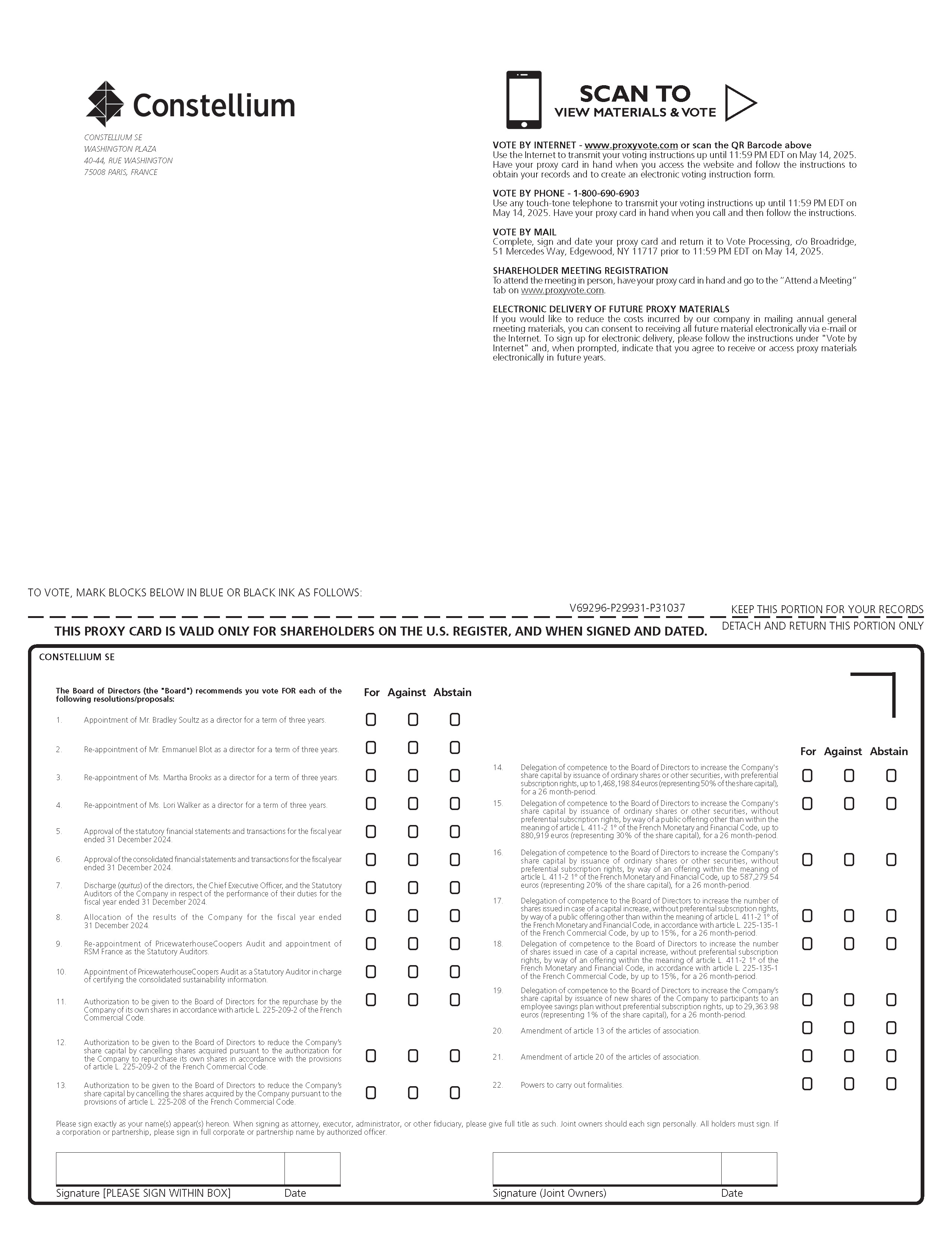 签名【请在方框内签名】日期签名(共同所有人)投票日期,在下面用蓝色或黑色墨水标记方块如下:为您的记录保留此部分DETACH并返回此部分仅此代理卡仅对美国登记册上的股东有效,并且在签名和日期时。V69296-P29931-P31037 CONSTELLIUM SE WASHINGTON PLAZA 40-44,RUE WASHINGTON 75008 Paris,France请完全按照您在此出现的姓名签名。以律师、被执行人、管理人、其他受托人身份签字时,请按此提供全称。共同所有人应各自亲自签字。所有持有人必须签字。如果是公司或合伙企业,请由授权官员签署完整的公司或合伙名称。优先认购权,通过欧元含义内的发售(占股本的20%)的方式,为期26个月。CONSTELLIUM SE董事会(“董事会”)建议您对以下决议/提案中的每一项投赞成票、反对票、弃权票:1。委任Bradley Soultz先生为董事,任期三年。!!!2.重新任命Emmanuel Blot先生为董事,任期三年。!!!赞成反对弃权3。续聘Martha Brooks女士为董事,任期三年。!!!14.授权董事会以发行普通股或其他证券的方式增加公司股本,具有优先认购权,最高可达1,468,198.84欧元(占股本的50%),!!!4.续聘Lori Walker女士为董事,任期三年。!!!15.为期26个月。向董事会授予发行普通股或其他证券增加公司股本的权限,无!!!5.批准截至2024年12月31日止财政年度的法定财务报表和交易。!!!优先认购权,以法国货币和金融法典第L.411-2条1 °含义以外的公开发售方式,最高880,919欧元(占股本的30%),期限26个月。6.7.批准截至2024年12月31日财政年度的合并财务报表和交易。解除(退出)董事、行政总裁及公司法定核数师就其履行职责为!!!!!!16.授权董事会通过发行普通股或其他证券增加公司股本,无需法国货币金融法典L.411-2 1 °条款,最高可达587,279.54!!!8.截至2024年12月31日的财政年度。分配公司截至2024年12月31日止财政年度的业绩。!!!17.根据第L. 225-135-1条,授权董事会增加在增资情况下发行的股票数量,不享有优先认购权,通过法国货币和金融法典第L. 411-2 1 °条含义以外的公开发行方式!!!9.重新任命普华永道会计师事务所审计,并任命RSM法国为法定审计师。!!!18.法国商法典,最多15%,为期26个月。向董事会下放权限,在增资情况下增加发行股票数量,无优先认购!!!10.任命罗兵咸永道审计为法定审计师,负责对综合可持续发展信息进行认证。!!!权利,根据法国《商法典》第L.225-135-1条,通过法国《货币和金融法典》第L.411-2条1 °含义内的要约方式,最多15%,为期26个月。11.根据法国《商法典》第L. 225-209-2条授权董事会就公司回购自己的股份。!!!19.20.授权董事会通过向无优先认购权的员工储蓄计划参与者发行公司新股来增加公司股本,最高可达29,363.98欧元(占股本的1%), 为期26个月。章程第十三条修正案。!!!!!!12.授权董事会根据法国《商法典》第L. 225-209-2条的规定,通过注销根据授权公司回购其自身股份而获得的股份来减少公司股本。!!!21.修改章程第二十条。!!!13.授权董事会根据法国《商法典》第L. 225-208条的规定,通过注销公司获得的股份来减少公司股本。!!!22.办理手续的权力。!!!扫描查看材料&通过互联网投票-www.proxyvote.com或扫描上面的二维码使用互联网传输您的投票指示,直至美国东部时间2025年5月14日晚上11:59。当您访问网站并按照指示获取您的记录和创建电子投票指示表时,请准备好您的代理卡。电话投票-1-800-690-6903在美国东部时间2025年5月14日晚上11:59之前,使用任何按键式电话传送您的投票指示。打电话时要准备好代理卡,然后按照指示操作。邮寄投票完成,签署并注明日期您的代理卡,并在美国东部时间2025年5月14日晚上11:59之前将其交回Vote Processing,c/o Broadridge,51 Mercedes Way,Edgewood,NY 11717。股东大会登记亲自出席会议,手持代理卡,上www.proxyvote.com“出席会议”标签。未来代理材料的电子交付如果您希望减少我公司邮寄年度股东大会材料所产生的费用,您可以同意通过电子邮件或互联网以电子方式接收未来的所有材料。报名参加电子投递,请按照“网络投票”下的说明办理,并在收到提示时,注明同意在未来年度以电子方式接收或访问代理材料。