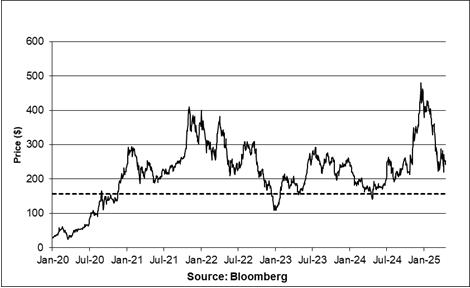 | 特斯拉公司的普通股–每日收盘价* 2020年1月2日至2025年4月16日 |