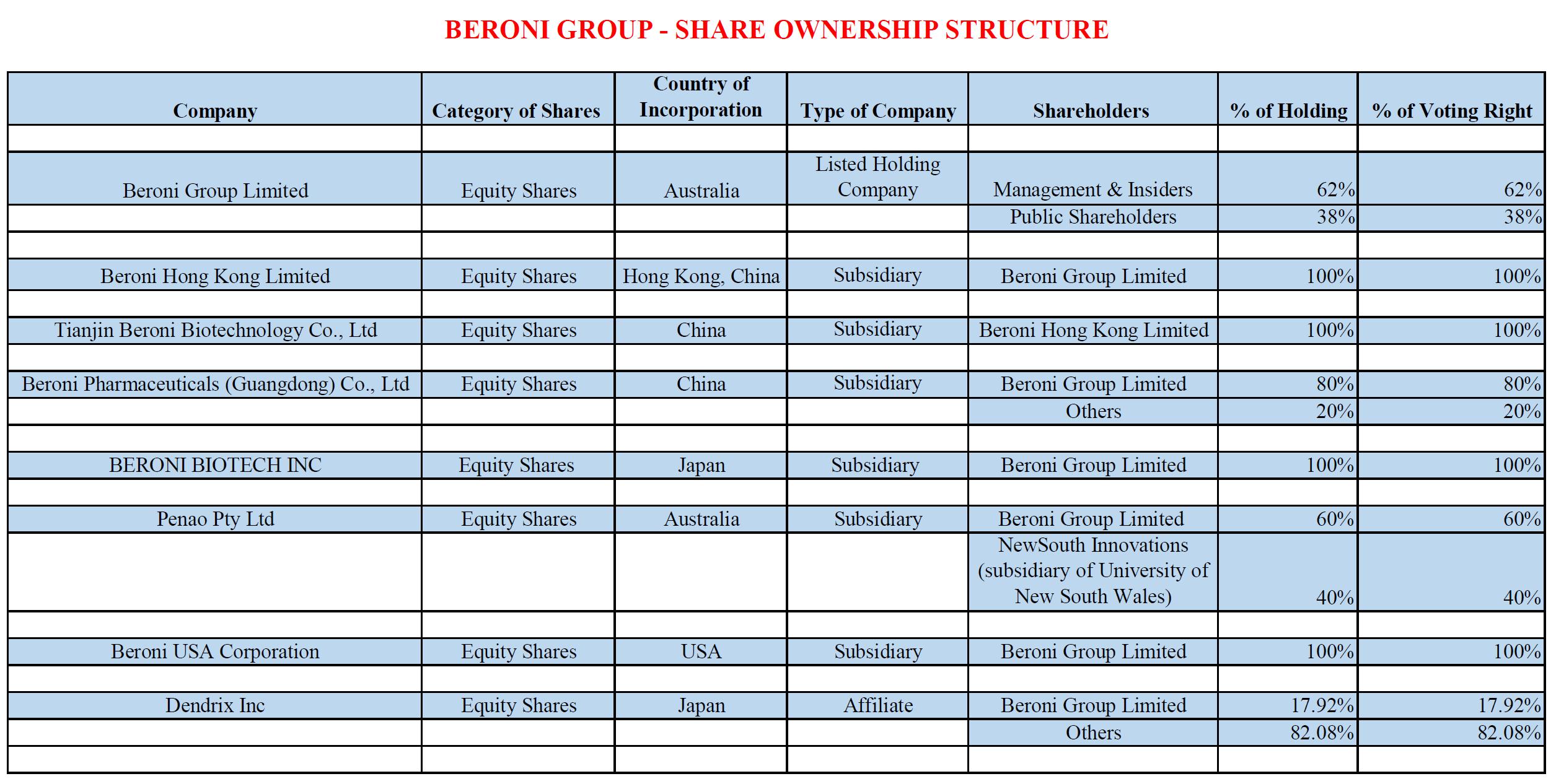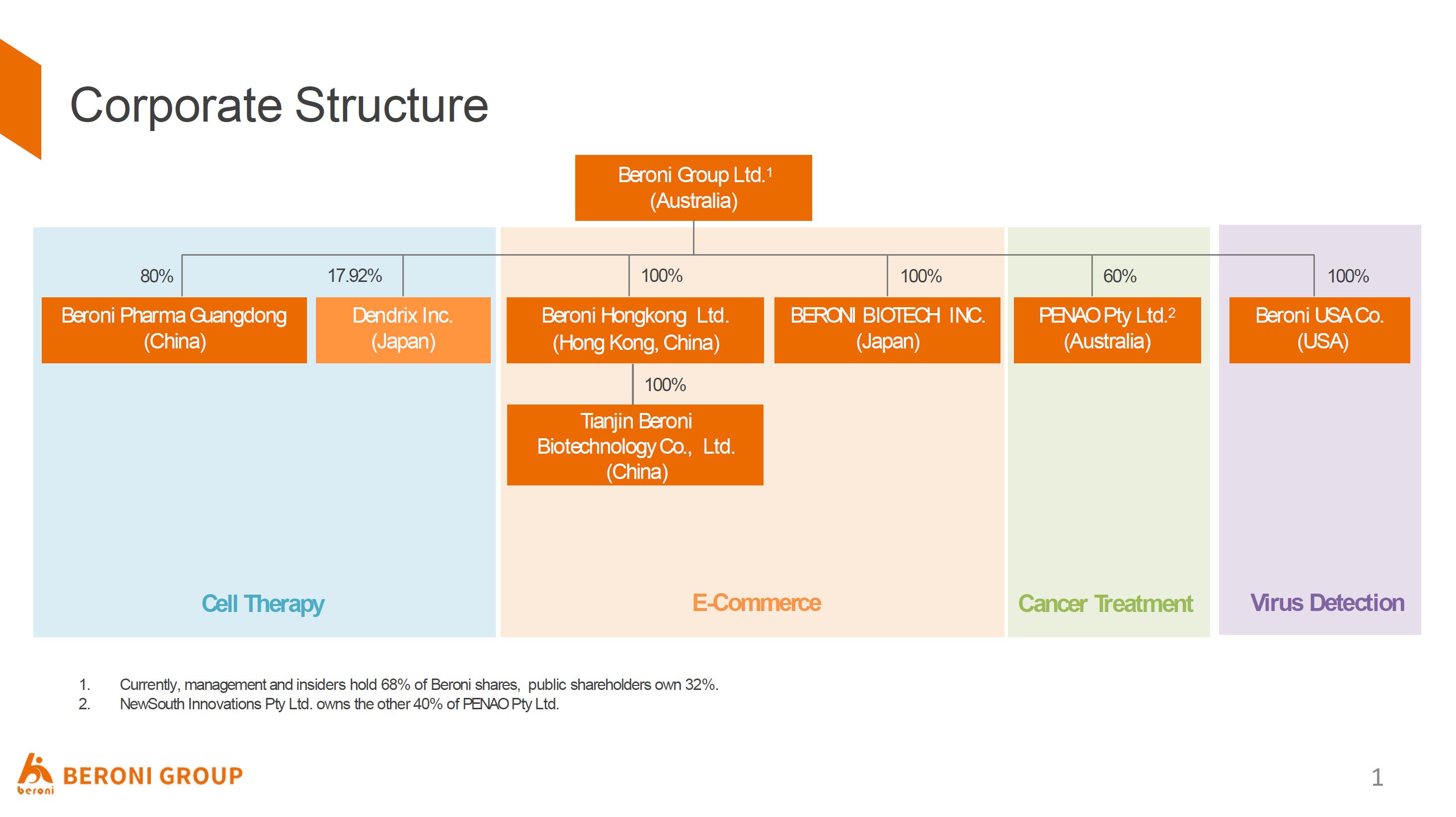 Beroni Group是一家澳大利亚控股公司,通过其全资和多数股权子公司开展业务。我们的主要业务大多位于中国境外。具体而言,(i)我们公司四项主要业务活动中的三项,即研发抗癌药物、细胞疗法以及传染病的检测和诊断,分别通过其在澳大利亚、日本和美国的子公司进行;(ii)这些业务活动的主要营业地点是位于中国境外的实验室和办事处。我们的公司结构不包含任何可变利益实体。此次发行的投资者将获得澳大利亚控股公司Beroni Group Limited的普通股,不会直接投资于我们的中国运营公司天津贝罗尼生物技术有限公司(Beroni Tianjin),后者是Beroni Hong Kong Ltd的全资子公司,由澳大利亚控股公司全资拥有,而Beroni Pharmaceuticals(Guangdong)Co.,Ltd(Beroni Guangdong)由澳大利亚控股公司拥有多数股权(80%)。Beroni Tianjin是在中国天津注册成立的公司,其所有资产都在这里持有,业务也在这里进行。贝罗尼广东于2021年11月26日在中国广东珠海新成立,未来拟致力于药物研发业务,但目前尚未实际开展任何研发活动。