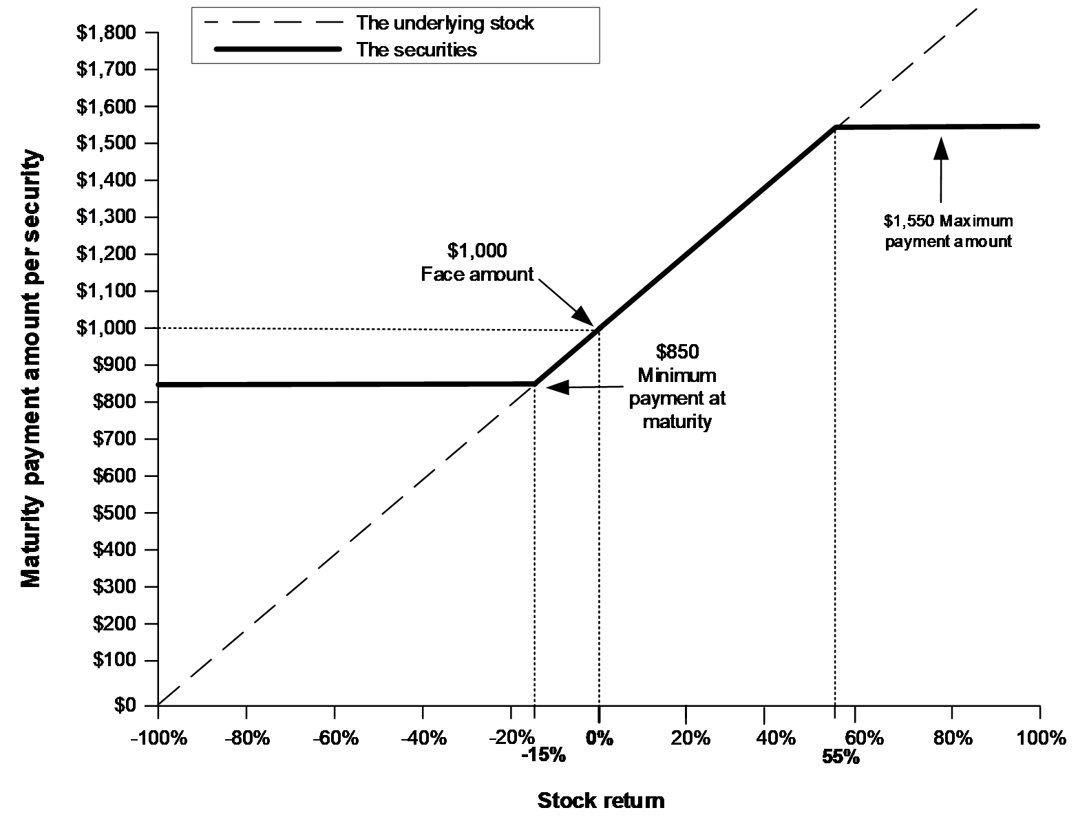 “最高回报”为每份证券票面金额的55.00%(每份证券550美元)。由于最高回报,最高到期付款金额为每份证券1550美元 |