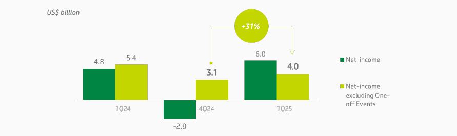 剔除一次性事件的净收入较24年第四季度增长30.7%。考虑一次性事件,由于财务业绩改善,净收入达到60亿美元,为正,为17亿美元,受益于期末汇率升值7%,反映了货币变动对巴西石油公司及其海外子公司之间债务的影响。