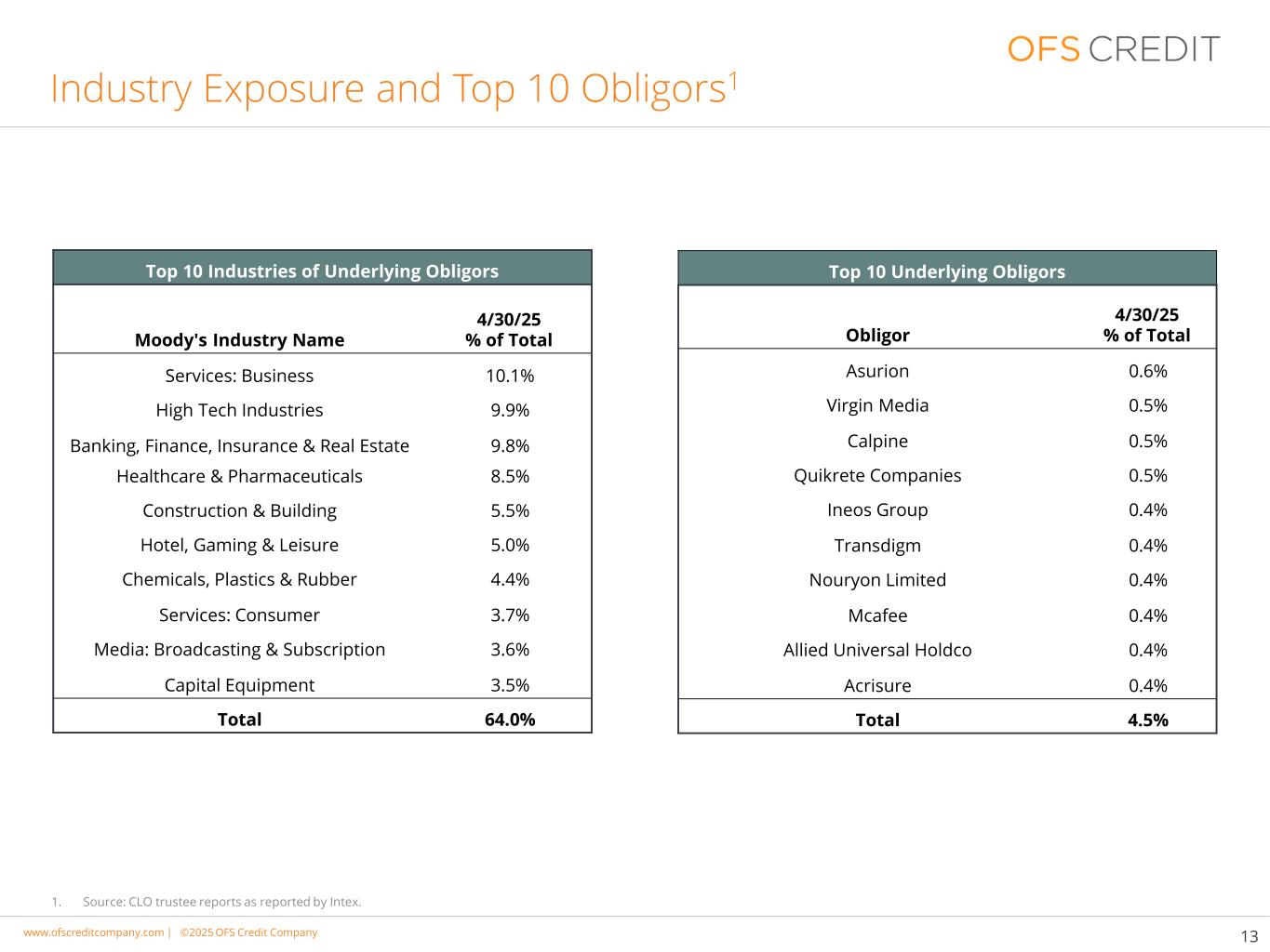 www.cimgroup.com |©2018年CIM集团|贸易机密/机密信息www.ofscreditcompany.com |©2025 OFS Credit公司行业敞口和前10名义务人113家前10名基础义务人义务人4/30/25%合计Asurion 0.6% Virgin Media 0.5% Calpine 0.5% Quikrete Companies 0.5% Ineos Group 0.4% Transdigm 0.4% Nouryon Limited 0.4% McAfee 0.4% Allied Universal Holdco 0.4% Acrisure 0.4% Total 4.5%标的义务人前10名行业总服务:商业10.1%高科技行业9.9%银行、金融、保险和房地产9.8%医疗保健和制药8.5%建筑和建筑5.5%酒店,博彩休闲5.0%化工塑胶4.4%服务:消费3.7%传媒:广电认购3.6%资本设备3.5%合计64.0% 1。资料来源:CLO受托人报告,如Intex报告。