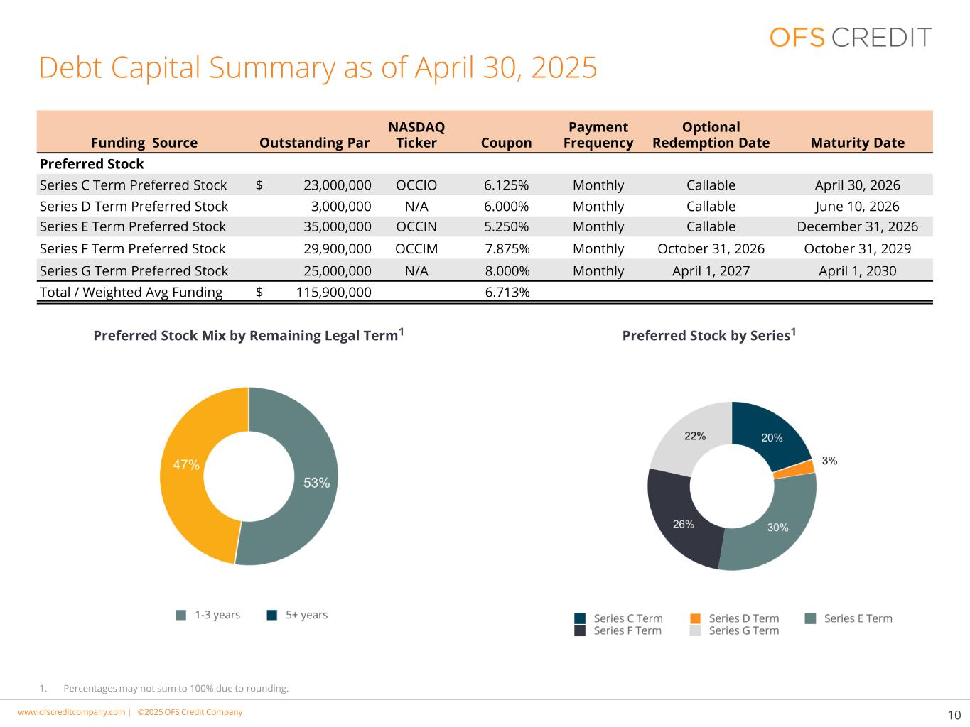 www.cimgroup.com |©2018年CIM集团|贸易机密/机密信息www.ofscreditcompany.com |©2025 OFS Credit公司债务资本汇总截至2025年4月30日的10按剩余法定期限的优先股组合1按系列划分的优先股1资金来源未偿还面值纳斯达克股票代码票息支付频率可选赎回日到期日优先股C系列期限优先股23,000,000美元OCCIO 6.125%每月可赎回2026年4月30日系列D期限优先股3,000,000不适用6.000%每月可赎回2026年6月10日系列E期限优先股35,000,000 OCCIN 5.250%每月可赎回12月31日,2026年F系列期限优先股29,900,000 OCCIM 7.875%月度2026年10月31日2029年10月31日G系列期限优先股25,000,000不适用8.000%月度2027年4月1日2030年4月1日总/加权平均资金115,900,000美元6.713% 1。由于四舍五入,百分比总和可能不等于100%。