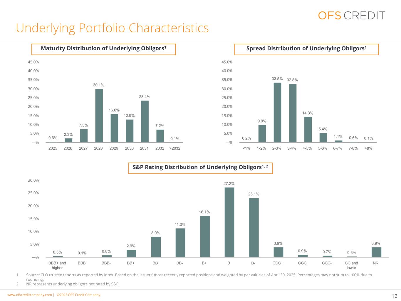 www.cimgroup.com |©2018年CIM集团|贸易机密/机密信息www.ofscreditcompany.com |©2025年OFS Credit公司标的投资组合特征丨标的债务人的标普评级分布1、2标的债务人的期限分布1标的债务人的利差分布11。资料来源:CLO受托人报告,如Intex报告。以截至2025年4月30日发行人最近报告的头寸为基础,按票面价值加权。由于四舍五入,百分比总和可能不等于100%。2.NR代表未获标普评级的基础义务人。12