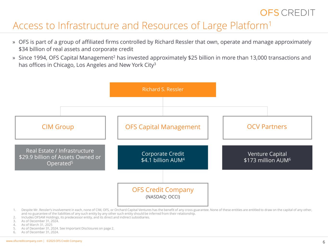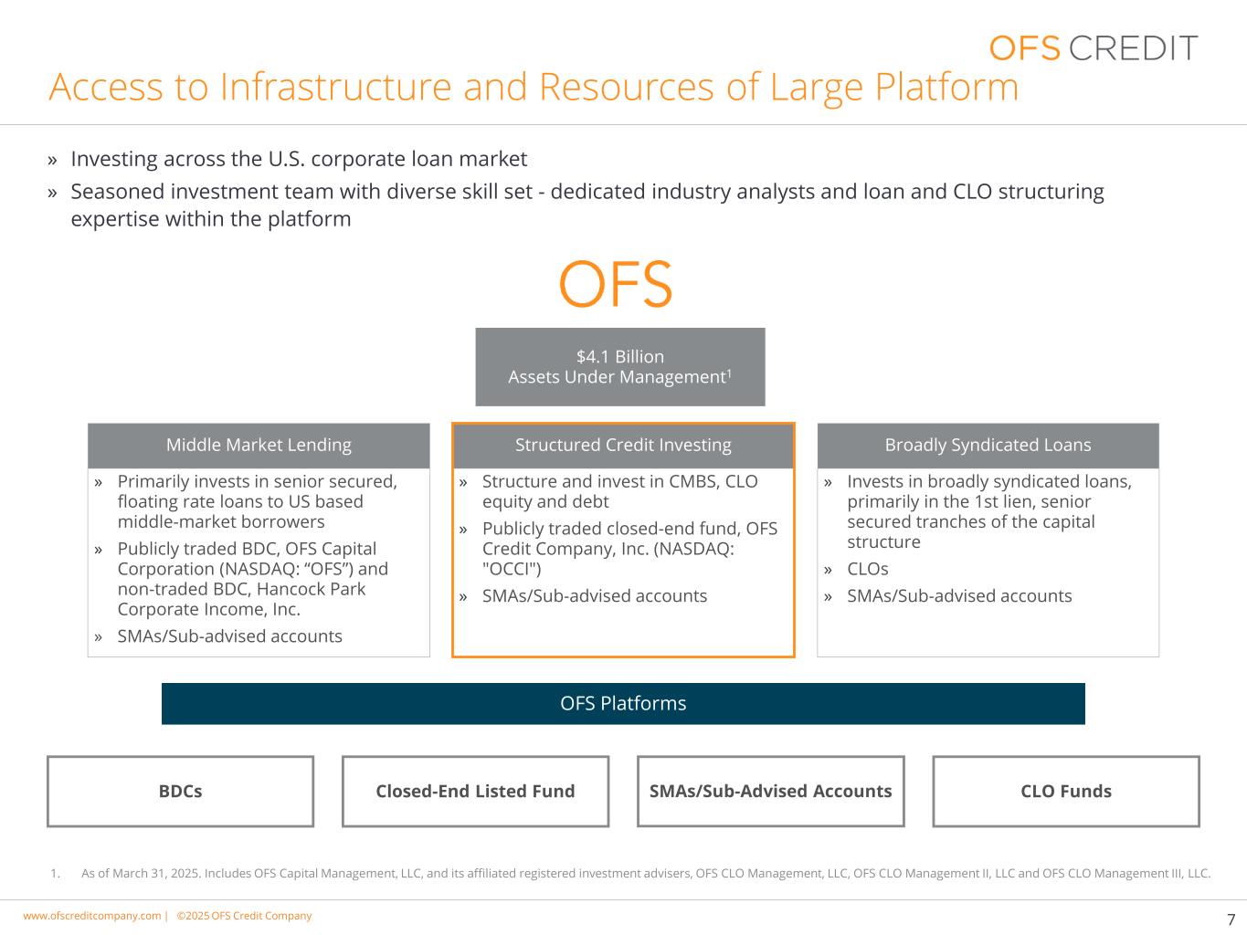 www.cimgroup.com |©2018年CIM集团|贸易机密/机密信息www.ofscreditcompany.com |©2025 OFS Credit公司接入大平台基础设施和资源71。截至2025年3月31日。包括OFS Capital Management,LLC及其附属注册投资顾问、OFS CLO Management,LLC、OFS CLO Management II,LLC和OFS CLO Management III,LLC。管理下的41亿美元资产1 SMA/次级建议账户CLO FundsBDCs OFS平台封闭式上市基金»主要投资于向美国中间市场借款人提供的高级有担保浮动利率贷款»公开交易的BDC、OFS Capital Corporation(NASDAQ:“OFS”)和非交易的BDC、Hancock Park Corporate Income,Inc. » SMA/次级建议账户中间市场贷款»投资于广泛的银团贷款,主要是第一留置权,资本结构的高级有担保部分» CLO » SMA/次级建议账户广义银团贷款» CMBS,CLO股权和债权»公开交易的封闭式基金,OFS Credit公司,Inc.(纳斯达克股票代码:“OCCI”)» SMA/次级建议账户结构化信贷投资»投资于整个美国公司贷款市场»经验丰富的投资团队,拥有多样化的技能组合-专门的行业分析师以及平台内的贷款和CLO结构化专业知识
