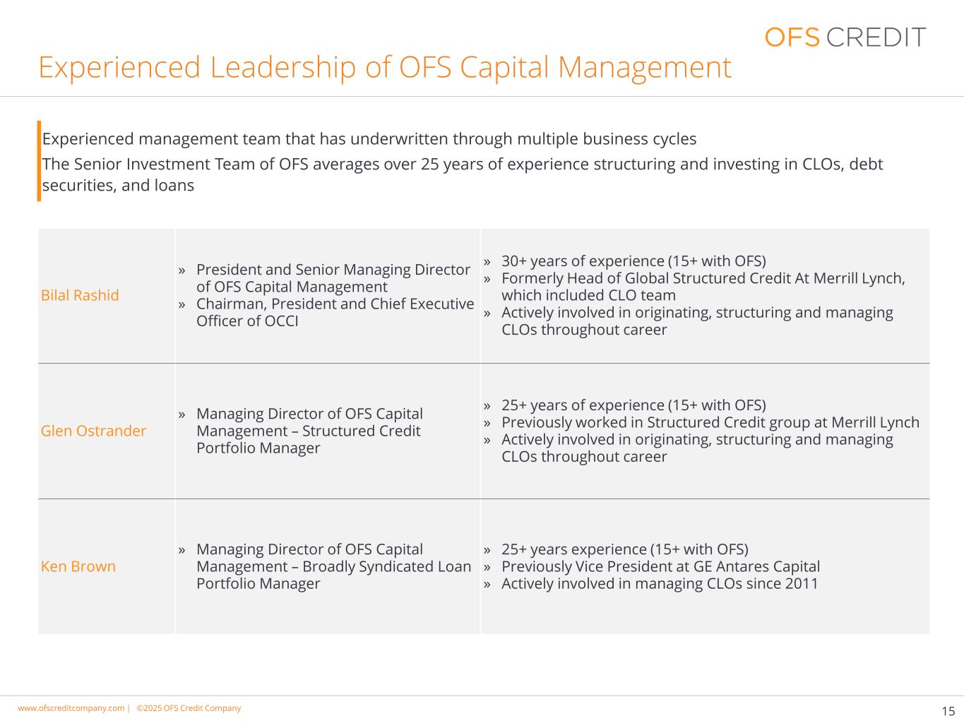 www.cimgroup.com |©2018年CIM集团|贸易机密/机密信息www.ofscreditcompany.com |©2025 OFS Credit公司15位经验丰富的OFS资本管理领导层丨比拉勒·拉希德Bilal Rashid » OFS资本管理总裁兼高级董事总经理» OCCI董事长、总裁兼首席执行官» 30多年经验(15 +与OFS合作)»曾任美林全球结构性信贷主管,其中包括CLO团队»积极参与发起,在整个职业生涯中构建和管理CLO Glen Ostrander » OFS Capital Management董事总经理–结构化信贷投资组合经理» 25年以上经验(15 +与OFS合作)»曾任职于美林结构性信贷集团»积极参与发起,在整个职业生涯中构建和管理CLO Ken Brown » OFS资本管理公司董事总经理–广泛的银团贷款投资组合经理» 25年以上经验(与OFS合作15年以上)»曾任GE Antares Capital副总裁»自2011年以来积极参与管理CLO经验丰富的管理团队,在多个业务周期中进行了承销OFS的高级投资团队平均拥有超过25年的CLO、债务证券和贷款的构建和投资经验