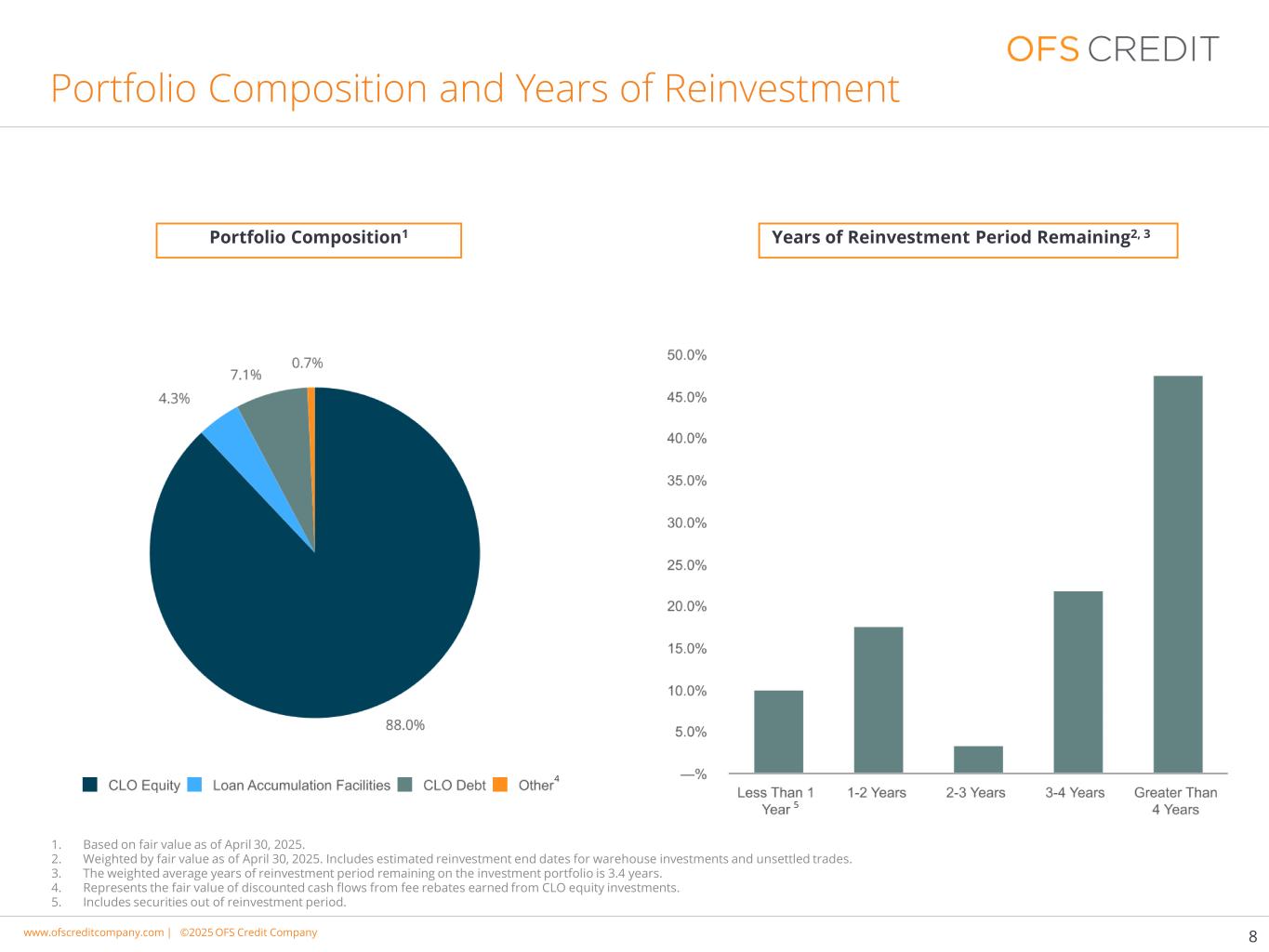 www.cimgroup.com |©2018年CIM集团|贸易机密/机密信息www.ofscreditcompany.com |©2025年OFS Credit公司投资组合构成及再投资年限8年再投资期剩余2、3投资组合构成11。基于截至2025年4月30日的公允价值。2.截至2025年4月30日按公允价值加权。包括仓库投资和未结算交易的估计再投资结束日期。3.投资组合剩余再投资期限的加权平均年限为3.4年。4.表示CLO股权投资赚取的费用回扣产生的贴现现金流的公允价值。5.包括超出再投资期的证券。4 5