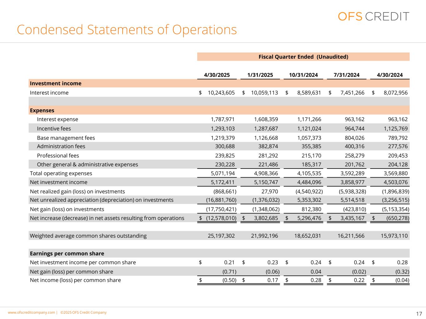 www.cimgroup.com |©2018年CIM集团|贸易机密/机密信息www.ofscreditcompany.com |©2025 OFS Credit公司简明经营报表17财季末(未经审计)4/30/20251/31/202510/31/20247/31/20244/30/2024投资收益利息收入$ 10,243,605 $ 10,059,113 $ 8,589,631 $ 7,451,266 $ 8,072,956费用利息支出1,787,9711,608,3591,171,266963,162963,162奖励费用1,293,1031,287,6871,121,0 24964,7441,125,769基本管理费1,219,3791,126,6681,057,373804,026789,792管理费300688382,874355,385400,316277,576专业费用239,825281,29投资收益5,172,4115,150,7474,484,0963,858,9774,503,076投资已实现净收益(亏损)(868,661)27,970(4,540,922)(5,938,328)(1,896,839)投资未实现净增值(折旧)(16,881,760)(1,376,032)5,353,3025,514,518(3,256,515)投资净收益(亏损)(17,750,421)(1,348,062)812,380(423,810)(5,153,354)经营产生的净资产净增加(减少)$(12,578,010)$ 3,802,685 $ 5每股普通股净收益(亏损)$(0.50)$ 0.17 $ 0.28 $ 0.22 $(0.04)