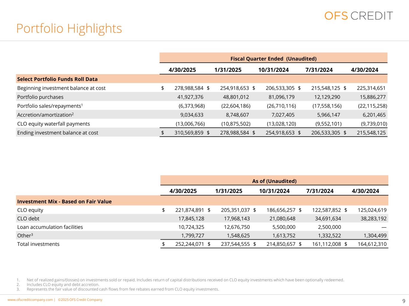 www.cimgroup.com |©2018年CIM集团|贸易机密/机密信息www.ofscreditcompany.com |©2025年OFS Credit公司投资组合亮点91.。扣除已出售或偿还投资的已实现收益/(损失)。包括可选择赎回的CLO股权投资收到的资本分配的回报。2.包括CLO股权和债务增值。3.表示CLO股权投资赚取的费用回扣产生的贴现现金流的公允价值。财政季度终了(未经审计)4/30/20251/31/202510/31/20247/31/20244/30/2024 Select Portfolio Funds Roll Data Beginning investment balance at cost $ 278,988,584 $ 254,918,653 $ 206,533,305 $ 215,548,125 $ 225,314,651 Portfolio purchases 41,927,37648,801,01281,096,17912,129,29015,886,277 Portfolio sales/repayments1(6,373,968)(22,604,186)(26,710,116)(17,558,156)(22,115,258)accre125,024,619 CLO债务17,845,12817,968,14321,080,64834,691,63438,283,192贷款积累便利10,724,32512,676,7505,500,0002,500,000 —其他31,799,7271,548,6251,613,7521,332,5221,304,499投资总额$ 252,244,071 $ 237,544,555 $ 214,850,657 $ 161,112,008 $ 164,612,310