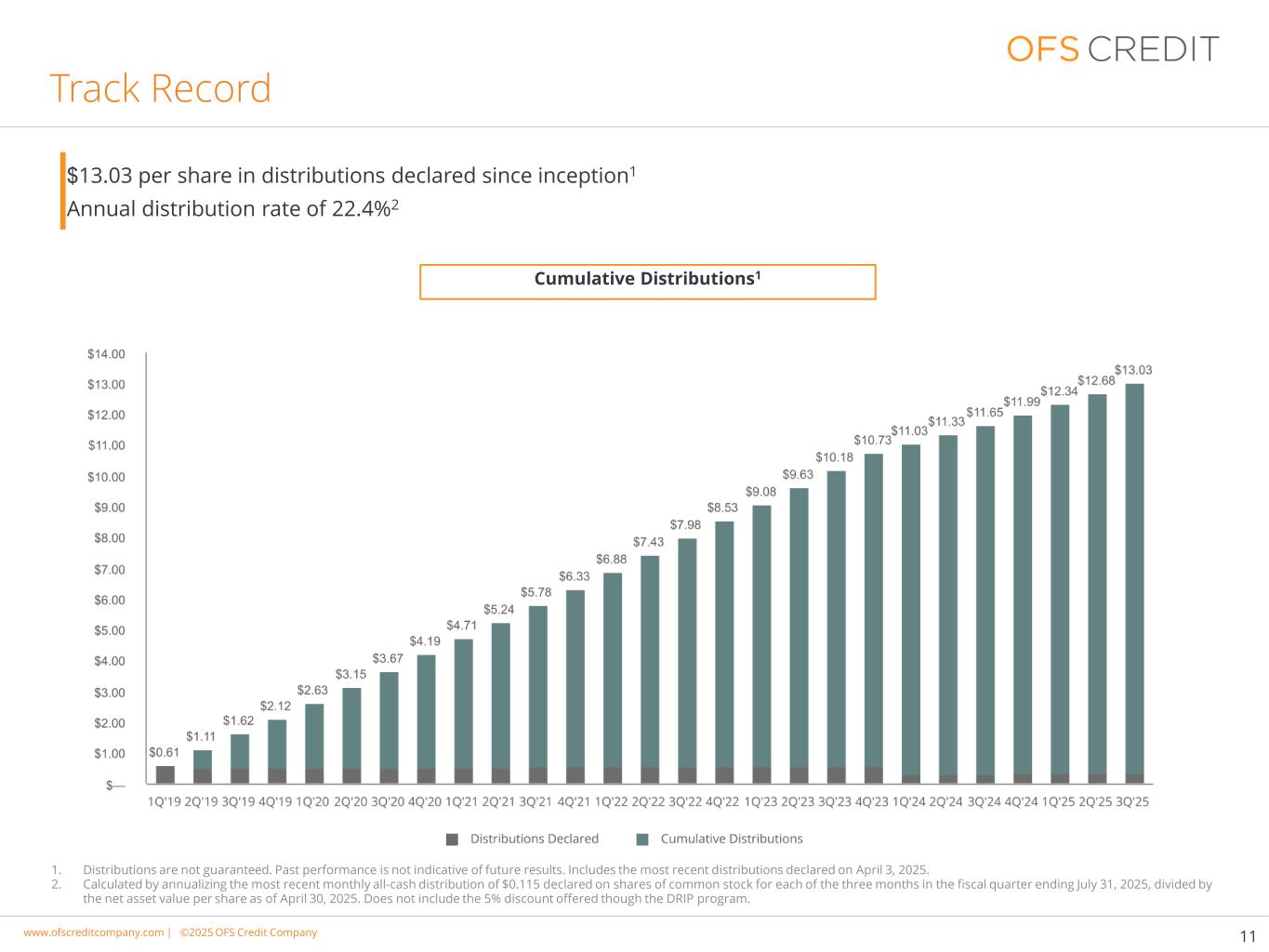 www.cimgroup.com |©2018年CIM集团|贸易机密/机密信息www.ofscreditcompany.com |©2025年OFS Credit公司往绩记录11累计分配1自成立以来宣布的分配每股13.03美元1年度分配率为22.4% 21。不保证发放。过去的表现并不代表未来的结果。包括2025年4月3日宣布的最新分配。2.计算方法是将截至2025年7月31日的财政季度的三个月中每个月宣布的普通股股份最近的每月全现金分配0.115美元进行年化除以截至2025年4月30日的每股净资产值。不包括通过DRIP计划提供的5%折扣。