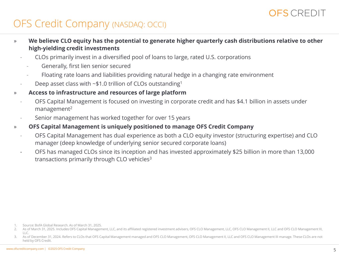 www.cimgroup.com |©2018年CIM集团|贸易机密/机密信息www.ofscreditcompany.com |©2025年OFS Credit公司»我们认为,与其他高收益信贷投资相比,CLO股权有可能产生更高的季度现金分配—— CLO主要投资于向受评级的美国大型公司提供的多元化贷款池——一般来说,第一留置权优先担保-浮动利率贷款和负债在不断变化的利率环境中提供自然对冲-拥有约1.0万亿美元未偿CLO的深度资产类别1 »获得大型平台的基础设施和资源-OFS Capital Management专注于投资于企业信贷,管理的资产达41亿美元2-高级管理层已合作超过15年» OFS Capital Management在管理OFS Credit公司方面具有独特的优势-OFS Capital Management拥有CLO股权投资者(结构化专业知识)的双重经验和CLO经理(对基础高级担保公司贷款有深入了解)-OFS自成立以来一直管理CLO,主要通过CLO工具在超过13,000笔交易中投资了约250亿美元351。资料来源:美国银行全球研究。截至2025年3月31日。2.截至2025年3月31日。包括OFS Capital Management,LLC及其附属注册投资顾问、OFS CLO Management,LLC、OFS CLO Management II,LLC和OFS CLO Management III,LLC。3.截至2024年12月31日。指OFS Capital Management管理的CLO和OFS CLO Management、OFS CLO Management II、LLC和OFS CLO Management III管理的CLO。这些CLO不由OFS Credit持有。OFS Credit公司(NASDAQ:OCCI)