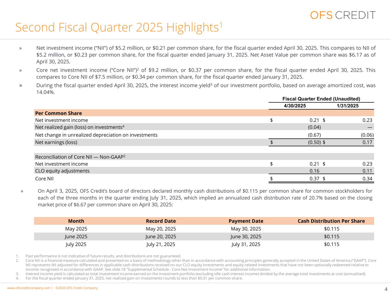 www.cimgroup.com |©2018年CIM集团|贸易秘密/机密信息www.ofscreditcompany.com |©2025年OFS Credit公司»截至2025年4月30日的财季,净投资收入(“NII”)为520万美元,即每普通股0.21美元。相比之下,截至2025年1月31日的财季,NII为520万美元,合每股普通股0.23美元。截至2025年4月30日,每股普通股资产净值为6.17美元。»截至2025年4月30日的财季,核心净投资收益(“核心NII”)2为920万美元,即每股普通股0.37美元。相比之下,截至2025年1月31日的财季,Core NII为750万美元,合每股普通股0.34美元。»在截至2025年4月30日的财政季度,我们投资组合的利息收入收益率3,基于平均摊余成本,为14.04%。4 1.过去的表现并不代表未来的结果,也不保证分配。2.核心NII是一种财务计量,其计算和列报依据的不是按照美国普遍接受的会计原则(“GAAP”)的方法。核心NII是指相对于根据公认会计原则确认的收入而言,我们的CLO股权投资和与股权相关的投资未被选择性赎回的适用现金分配差异调整后的NII。有关更多信息,请参见幻灯片18“补充时间表-核心净投资收益”。3.利息收入收益率的计算方法为投资组合赚取的总投资收益(不含闲置现金利息收入)除以按成本计算的平均总投资(年化)。4.截至2025年1月31日的财季,投资轮次实现的净收益低于每股普通股0.01美元。财政季度末(未经审计)4/30/20251/31/2025每普通股净投资收益0.21美元0.23美元已实现投资净收益(亏损)4(0.04)—未实现投资折旧净变化(0.67)(0.06)净收益(亏损)$(0.50)$ 0.17核心NII对账—非GAAP净投资收益$ 0.21 $ 0.23 CLO股权调整0.16 0.11核心NII $ 0.37 $ 0.34 » 2025年4月3日,OFS Credit董事会宣布,在截至7月31日的季度中,每个季度的每个月,普通股股东的每月现金分配为0.115美元,2025年,这意味着基于2025年4月30日收盘价每股普通股6.67美元的年化现金分配率为20.7%:月份记录日期支付日期每股现金分配2025年5月20日2025年5月30日0.115美元2025年6月20日2025年6月30日0.115美元2025年7月21日2025年7月31日0.115美元2025年第二财季亮点1