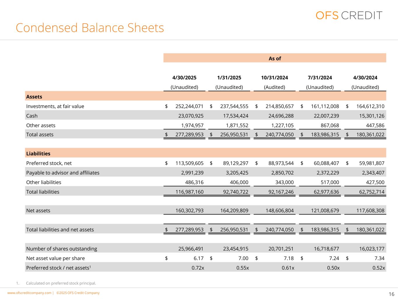 www.cimgroup.com |©2018年CIM集团|贸易机密/机密信息www.ofscreditcompany.com |©2025 OFS Credit公司16简明资产负债表截至4/30/20251/31/202510/31/20247/31/20244/30/2024(未经审计)(未经审计)(经审计)(未经审计)(未经审计)资产投资,按公允价值计算$ 252,244,071 $ 237,544,555 $ 214,850,657 $ 161,112,008 $ 164,612,310现金23,070,92517,534,42424,696,28822,007,23915,301,126其他资产1,974,9571,871,5521,227,105867,068447,586总资产277,289,953美元256,950,531美元240,774,050美元183,986,315美元180,361净额113,509,605美元89,129,297美元88,973,544美元60,088,407美元59,981,807美元应付顾问和附属公司2,991,2393,205,4252,850,7022,372,2292,343,407其他负债486,316406,000343,000517,000427,500总负债116,987,16092,740,72292,167,24662,977,63662,752,714净资产160,302,793164,209,809148,606,804121,008,679117,608,308总负债和净资产277,289,953美元256,950,531美元240,774,050美元183,986按优先股本金计算。