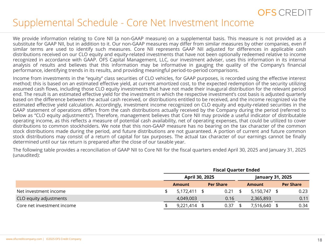 www.cimgroup.com |©2018年CIM集团|贸易机密/机密信息www.ofscreditcompany.com |©2025年OFS Credit公司补充附表-核心净投资收益18我们在补充基础上提供与核心NII(非GAAP衡量标准)相关的信息。这项措施不是作为GAAP NII的替代提供的,而是作为它的补充。我们的非GAAP衡量标准可能与其他公司的类似衡量标准不同,即使使用类似术语来识别此类衡量标准。核心NII代表GAAP NII,根据我们的CLO股权和股权相关投资收到的适用现金分配的差异进行了调整,这些投资相对于根据GAAP确认的收入没有可选地赎回。我们的投资顾问OFS Capital Management,LLC在其内部结果分析中使用了这些信息,并认为这些信息可能有助于衡量公司财务业绩的质量,识别其结果的趋势,并提供有意义的期间比较。就公认会计原则而言,CLO工具“股权”类证券的投资收入使用实际利率法入账;这是基于使用假定现金流预期赎回证券的估计有效收益率,按当前摊余成本计算,包括那些未在相关期间结束时进行首次分配的CLO股权投资。其结果是根据实际收到的现金或有权收到的分配与通过估计的有效收益率计算确认的收益之间的差额,每季度调整相应投资的成本基础的投资的估计有效收益率。因此,在GAAP经营报表中就CLO股权和股权相关证券确认的投资收益与公司在该期间实际收到的现金分配(以下简称“CLO股权调整”)存在差异。因此,管理层认为,Core NII可能会提供一个有用的可分配营业收入指标,因为这反映了一种衡量潜在现金可用性的指标,扣除营业费用,可用于支付对普通股股东的分配。我们注意到,这一非GAAP衡量标准与该期间进行的普通股分配的税收性质没有关系,未来的分配也不能得到保证。当前和未来普通股分配的一部分可能包括出于税收目的的资本回报。在我们的纳税年度结束后编制纳税申报表之前,我们的收入的实际纳税性质无法最终确定。下表提供了截至2025年4月30日和2025年1月31日的财政季度(未经审计)的GAAP NII与核心NII的对账:截至2025年4月30日的财政季度2025年1月31日每股金额每股金额净投资收益$ 5,172,411 $ 0.21 $ 5,150,747 $ 0.23 CLO股权调整4,049,0030.16 2,365,8930.11核心净投资收益$ 9,221,414 $ 0.37 $ 7,516,640 $ 0.34