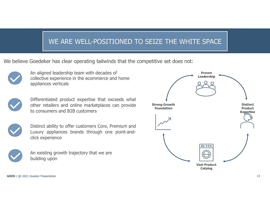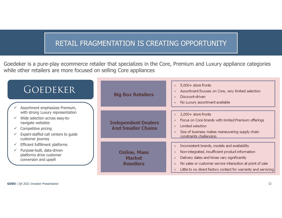 î 5 , 000 + s t或e f ron t t s î品种集中在核心, 非常有限的选择?折扣驱动?没有可供选择的奢侈品?2, 000 + s î或e f ron t î s专注于核心品牌,提供有限的优质产品î有限的选择î业务规模使得机动的供应链限制挑战印度和较小的连锁企业î不一致的品牌, 模型和可用性:非集成的, 产品信息不足î交付日期和时间差异很大î在销售点没有销售或客户服务互动î很少或没有在线保修和服务的直接工厂联系, 大型零售商Goedeker是一家纯正的电子商务零售商,专注于核心, 高端和豪华家电类别,而其他零售商更专注于销售核心家电零售碎片化正在创造机会x分类强调高端, 具有强大的豪华代表性x在易于浏览的网站上有广泛的选择x具有竞争力的价格x配备专业人员的呼叫中心,以指导客户旅程x高效的履行平台x专门建造的, 数据驱动平台推动客户转化和追加销售Goed | 2021年第四季度投资者介绍12,