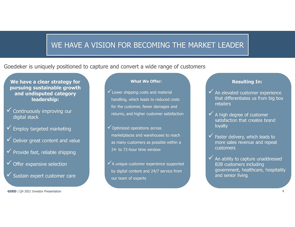 Goedeker在吸引和转化大范围客户方面处于独特的地位,我们有一个追求可持续增长和无可争议的品类领导地位的明确战略:x不断改进我们的数字产品栈x雇用大量的人员x提供优质的产品和价值x提供快速, 我们提供的是:x更低的运输成本和材料处理,,,,,,,,,,,,,,,,,,,,,,,,,,,,,,,,,,,,,,,,,,,,,,,,,,,,,,,,,,,,,,,,,,, 从而降低了客户的成本, 更少的损失和回报, 更高的客户满意度x优化跨市场和仓库的运营以在24至72小时内接触到尽可能多的客户x由数字内容支持的独特客户体验我们的专家团队提供全天候服务,结果是:提升了客户体验,使我们有别于大型零售商;客户满意度高,品牌忠诚度高;交货速度更快, 这将带来更多的销售收入和回头客x捕获未解决的B2B客户的能力,包括政府, 医疗保健, 酒店和老年生活我们的愿景是成为市场领导者GOED | 2021年第四季度投资者介绍4,