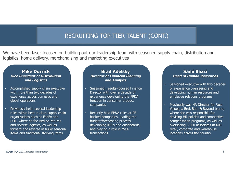 我们一直专注于建立我们的领导团队与经验丰富的供应链, 分销和物流, 送货上门, 招聘顶级人才的营销和市场主管乔迪•拉斯纳克是首席营销和品牌官•拥有30多年B2C和B2B经验的高级主管, 以及丰富的经验,不断增加产品种类和推动各个类别的增长•曾担任内布拉斯加州家具市场的电器和电子产品总监, 公司, MikeBarry是北美最大的家居用品商店之一,其配送总监•经验丰富的分销和物流主管,拥有20多年建设和管理一流供应链的经验, 运输和分销业务•最近在Pilot Furniture Direct和Last Mile Home担任高级职务, Kirstin Currie曾负责监督家电配送业务,并专门负责最后MILE配送流程,他的营销主管•拥有20年的B2B和B2C营销领导经验,涉及多个领域, 包括大小家电, 百思买十年来对消费电子产品和家庭用品的投入, 曾担任大、小家电品类营销高级总监等职务,2021年第四季度投资者报告会7,