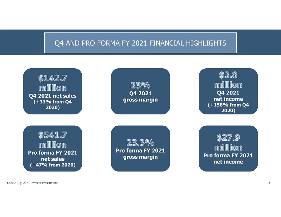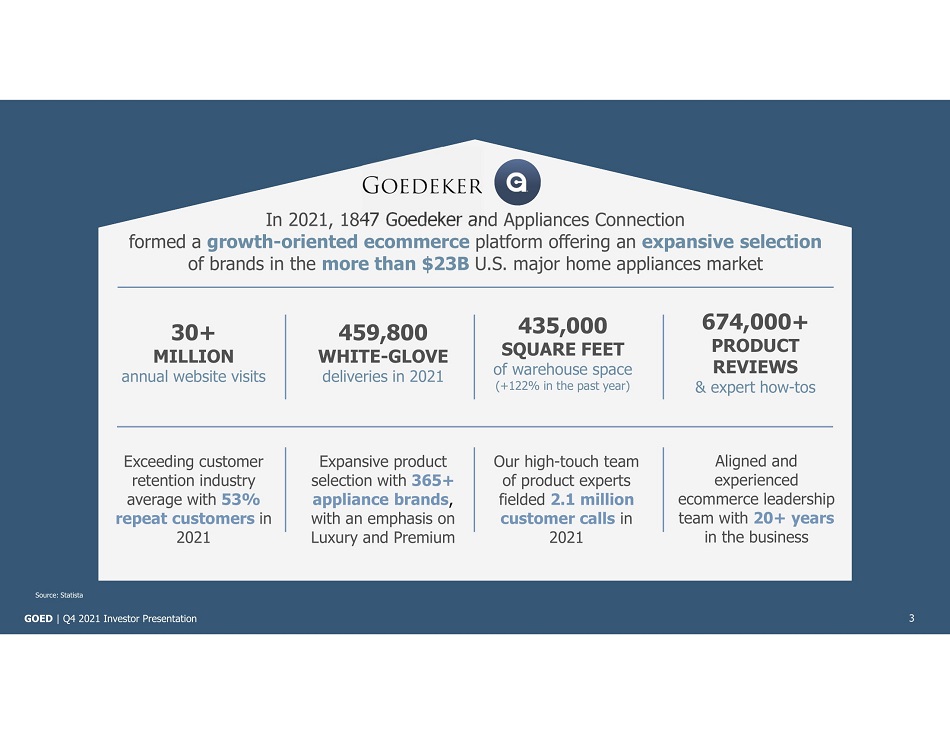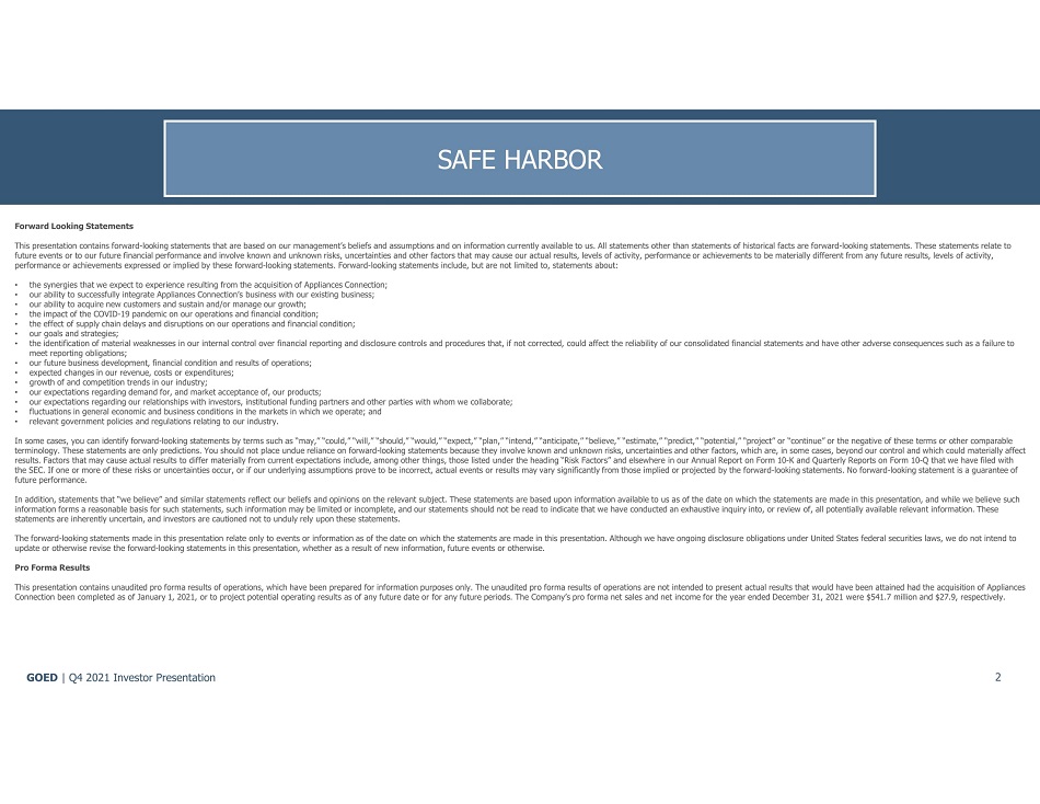 安全港前瞻性陈述本陈述包含基于我们管理层的信念和假设以及我们目前可用的格式的前瞻性陈述。历史事实陈述以外的所有陈述均为前瞻性陈述。这些ST特性与未来事件或我们未来的财务业绩有关,并涉及已知和未知的风险, AY不确定性和其他因素会导致我们的实际结果, 活跃程度, 表现或成就与任何未来结果大不相同, 活跃程度, 这些前瞻性陈述所表达或暗示的业绩或成就。前瞻性陈述包括, 但不仅仅限于, 关于以下方面的声明:•协同作用我们期望从收购Appliances Connection中获得的经验;•我们成功地将Appliances Connection的业务与现有业务整合的能力;•我们获得新客户的能力以及维持和/或管理我们的增长;• COVID-19大流行对我们的业务和财务状况的影响;•供应链延误和中断对我们的业务和财务状况的影响;•我们的目标和战略;•查明我们对财务报告和披露控制的内部控制的重大弱点,并提出以下建议: 如果不改正, 可能影响我们的综合财务报表的可靠性,并有其他不利影响,如未能履行报告义务;我们未来的业务发展, 财务状况和经营成果;•我们收入的预期变化, 成本或支出;•本行业的增长和竞争趋势;•我们对以下方面的需求的预期: 和市场的接受程度, 我们的产品;•我们对与投资者关系的期望; 与我们合作的机构资金伙伴和其他各方;•我们经营所在市场的总体经济和商业条件的波动;以及•与我们行业有关的相关政府政策和法规。在某些情况下, 您可以通过诸如“可能”、“可能”、“将”、“应该”、“将”、“预期”、“计划”、“打算”、“预期”、“相信”、“估计”、“预测”、“潜在”、“项目”或“继续”等术语来识别前瞻性陈述,或SE术语或其他类似术语的否定。这些陈述仅仅是预测。你不应过分依赖前瞻性陈述,因为这些陈述涉及已知和未知的风险, 不确定性和其他因素, 这是, 在某些情况下, 超出了我们的控制范围,并且会对结果产生实质性的影响。可能导致实际结果与当前预期大不相同的因素包括: 在其他事情中, OSE在“风险因素”标题下以及我们提交给SEC的Form 10-K年度报告和Form 10-Q季度报告的其他部分列出。如果这些风险或不确定性中的一个或多个发生, 或者如果我们的基本假设被证明是不正确的, 实际经济价值或结果可能与前瞻性陈述中暗示或预测的有很大差异.任何前瞻性的工作都不是未来表现的保证.此外, “我们相信”的陈述和类似的陈述反映了我们对相关主题的信念和意见。ESE陈述基于我们在本陈述中陈述之日所能获得的信息, 虽然我们相信这些信息为这些陈述提供了合理的依据, 这些信息可能是有限的或不完整的, 我们的声明并不表示我们已经进行了彻底的调查, 或审查, 所有可能的相关信息。这些陈述本质上是不确定的, 并提醒投资者不要过分依赖这些声明。本演示文稿中的前瞻性陈述仅涉及截至本演示文稿中陈述之日的事件或信息。虽然我们有持续的美国联邦证券披露义务, 我们不打算更新或以其他方式修改本演示文稿中的前瞻性陈述, 是否因为新的信息, 未来的e发泄或其他。预计结果本报告包含未经审计的预计经营成果, 仅供参考。未经审计的预计经营成果并不是为了提供实际结果,而实际结果是在1月1日之前完成了设备的连接, 2021 , 或预测任何未来日期或任何错误时期的潜在经营结果。公司截至12月31日年度的预计净销售额和净收入, 2021年分别为5.417亿美元和27.9美元, 分别是。GoEd | 2021年第四季度投资者介绍2,