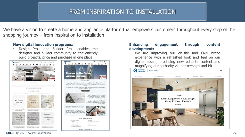 从灵感到安装,我们有一个愿景,创造一个家庭和家电平台在购物过程中的每一步——从灵感到安装新的数字创新程序:• Design Pro +和Builder Pro +使设计师和建造者社区能够方便地构建项目,在一个地方定价和购买,通过内容开发增强互动:•我们正在改进我们的网站和客户关系管理品牌体验,让我们的数字资产焕然一新,制作新的编辑内容,通过合作伙伴关系和公关扩大我们的权威| 2021年第四季度投资者介绍16