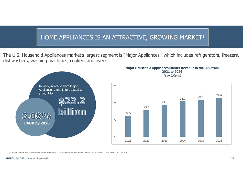 美国家电市场最大的细分市场是“大家电”,其中包括冰箱、冰柜、洗碗机、洗衣机、灶具和烤箱,到2022年,家用电器将成为一个有吸引力、不断增长的市场,2021年至2026年美国主要家用电器市场收入(十亿美元)22.52 3.28 2.8 24.24 4.4 24.6 202262022 2023 2024 202520252025202520252025202520252025(1)资料来源:Statista;Mordor Intelligence:美国主要家用电器市场-增长,趋势,COVID-19影响,以及Ecasts(2021-2026)Goed | 2021年第四季度投资者介绍10