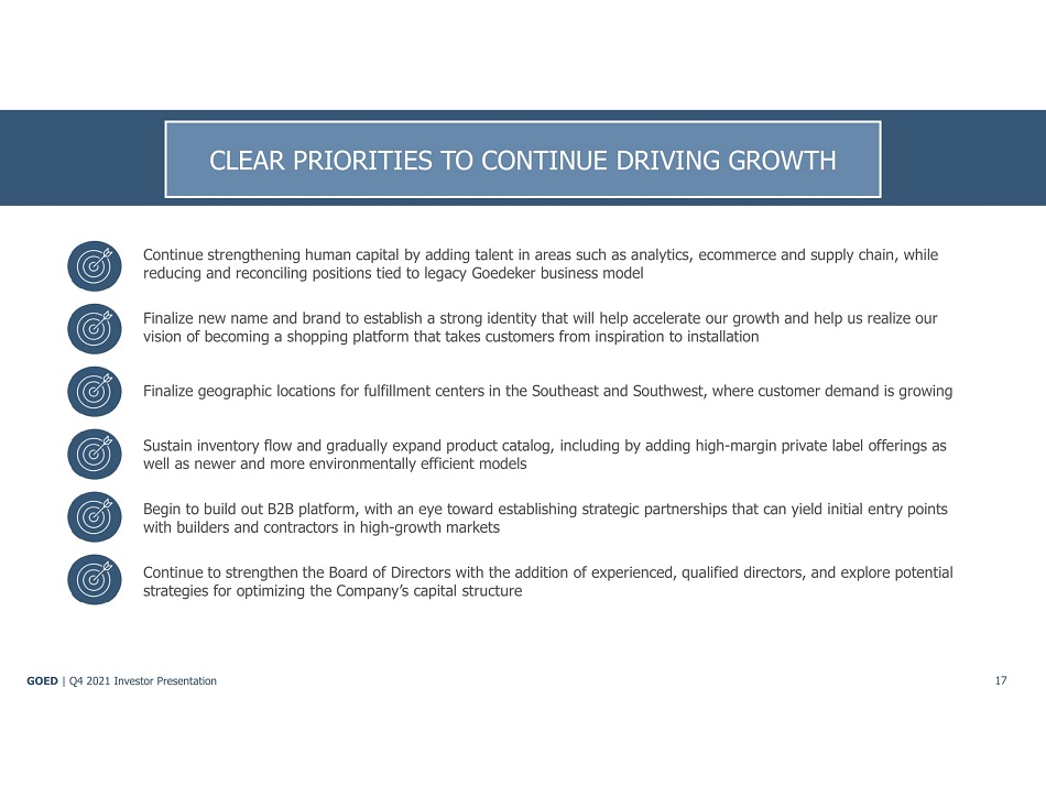 明确优先事项以继续推动增长继续通过增加分析等领域的人才来加强人力资本, 电子商务和供应链, 在减少和协调与传统Goedeker业务模式相关的职位的同时,最终确定新的名称和品牌,以建立强大的身份,这将有助于加速我们的增长,并帮助我们实现成为购物平台的愿景这将使客户从灵感到安装最终确定位于东南部和西南部的运营中心的地理位置, 在客户需求不断增长的情况下,保持库存流,并逐步扩大产品目录, 包括通过增加高利润的自有品牌产品以及更新和更环保的模式开始建立B2B平台, 着眼于建立战略合作伙伴关系,从而在高增长市场中与建筑商和承包商形成初步切入点, 符合资格的董事, 并探索优化公司资本结构的潜在战略Goed | Q42021 Investor Presentation 17,