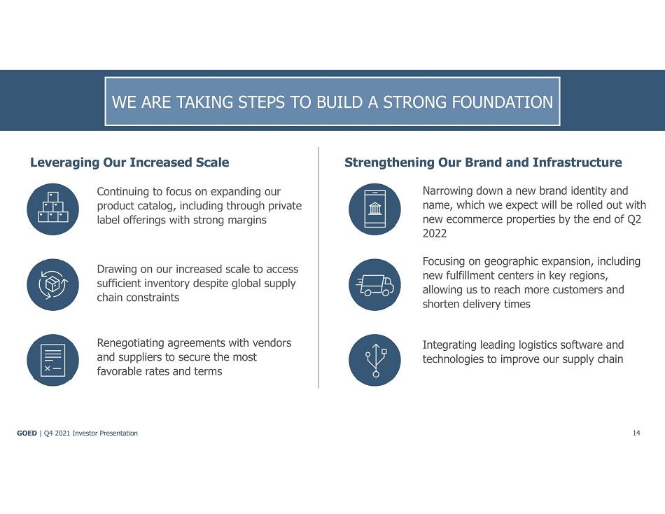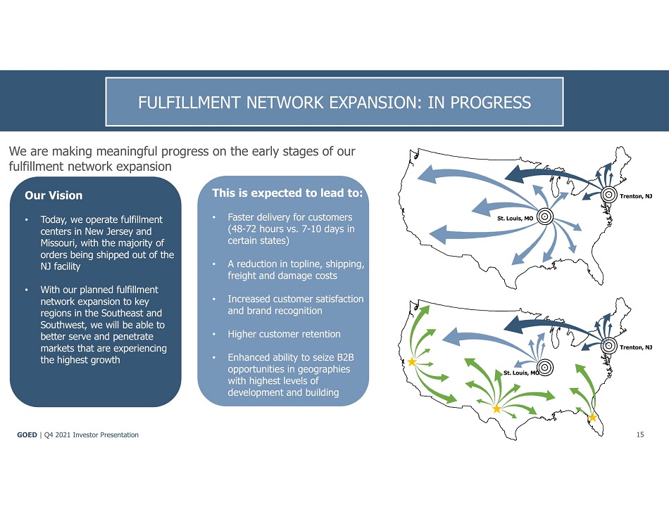 我们正在采取措施,利用我们不断扩大的规模,与供应商和供应商重新谈判协议,以获得最优惠的价格和条款,利用我们不断扩大的规模,以获得足够的库存,尽管全球供应链的制约因素继续专注于扩大我们的产品种类,包括通过自有品牌产品,大幅提高利润率,缩小新的品牌标识和名称,我们预计,到2022年第二季度末,这些产品将与新的电子商务项目一起推出,重点是地理扩张,包括在关键地区建立新的履行中心,允许我们接触更多的客户并缩短交货时间,整合领先的物流软件和技术以改善我们的供应链加强我们的品牌和基础设施Goed | 2021年第四季度投资者报告会14
