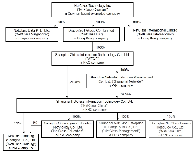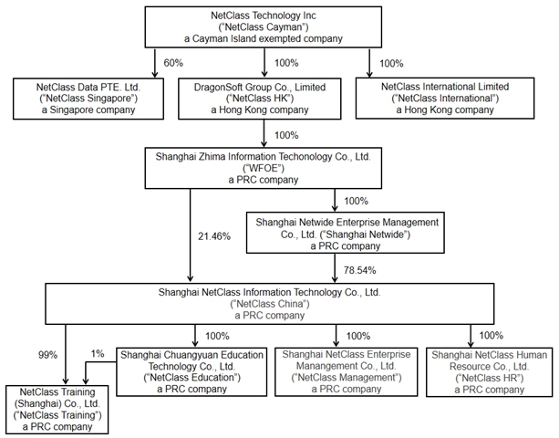 1.我们的股权结构为直接控股结构,即拟在美国上市的境外实体NETCLASS TECHNOLOGY INC(“NETClass”、“公司”),直接控制DRAGONSOFT GROUP CO.,LIMITED(“NETClass HK”)、NetClass International Limited(“NETClass International”)、上海智码信息科技有限公司(“WOFE”)、上海网课企业管理有限公司(“上海网课”)、上海网课信息技术有限公司(“网课中国”)、网课培训(上海)有限公司(“网课培训”)、上海创元教育科技有限公司(“网课教育”)、上海网课企业管理有限公司(“网课管理”)有限公司(“NetClass HR”)和NetCLASS DATA PTE有限公司(“NetClass Singapore”)。更多详情,请见第79页“公司Structure”。