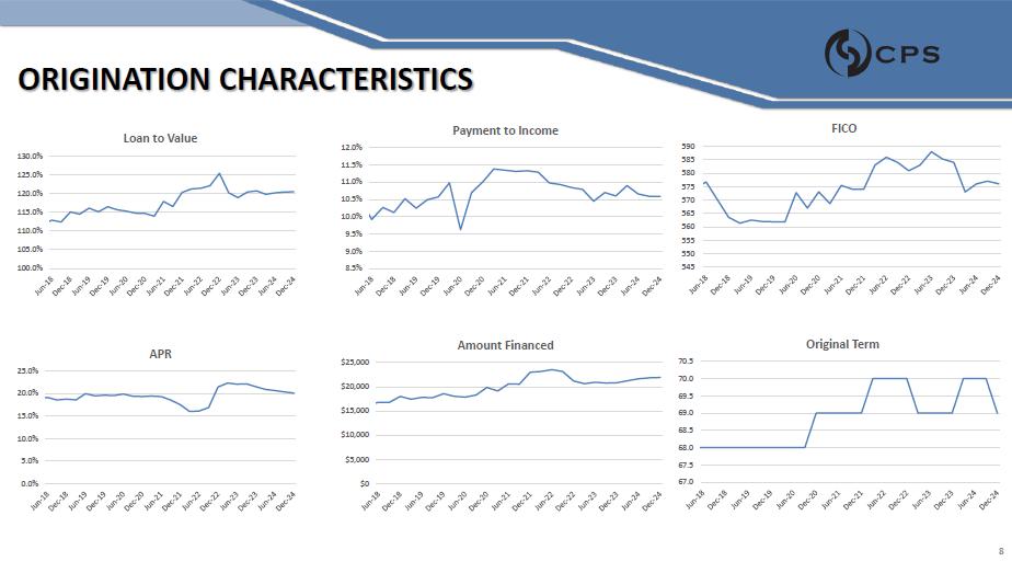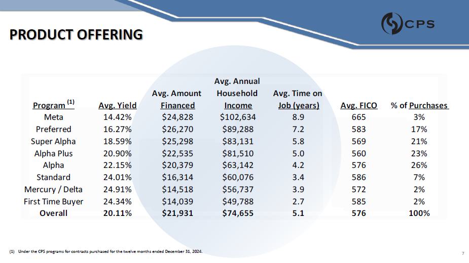 Product Offering Meta 14.42% $ 102,6343% Preferred 16.27% $ 89,28817% Super Alpha 18.59% $ 83,13121% Alpha Plus 20.90% $ 81,51023% Alpha 22.15% $ 63,14226% Standard 24.01% $ 60,0767% Mercury/Delta 24.91% $ 56,7372% First Time Buyer 24.34% $ 49,7882% Overall 20.11% $ 25,298 $ 22,535 $ 20,379 $ 16,314,518 $ 14,039 $ 21,931 $ 74,655583569560576586572585576100% % of purchases avg。产量计划(1)平均融资金额24,828美元平均26,270美元。家庭年收入平均在职时间(年)8.97.25.85.0 4.2 3.4 3.9 2.75.1平均FICO 665(1)根据CPS计划为截至2024年12月31日止十二个月购买的合同。7