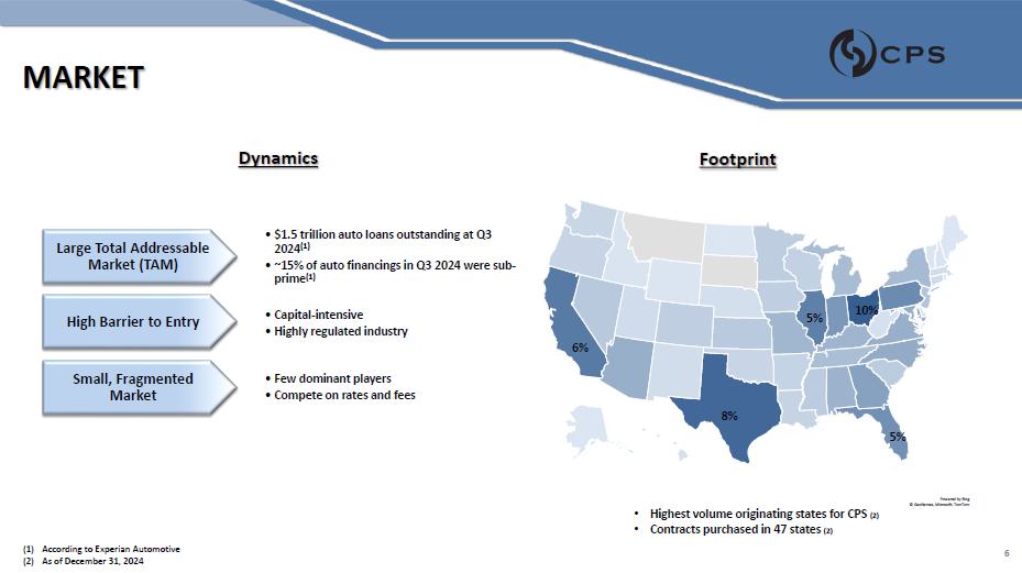 Market • 2024年第三季度未偿还的1.5万亿美元汽车贷款(1)• 2024年第三季度约15%的汽车融资为次级贷款(1)总可寻址市场(TAM)规模大•资本密集•受到高度监管的行业进入壁垒高•主要参与者寥寥无几•在费率和费用上展开竞争由Bing提供支持的小而分散的市场动态足迹©GeoNames、微软、TomTom(1)根据Experian Automotive(2)截至2024年12月31日的66% 8% 10% 5% 5% • CPS的最高原产州(2)•在47个州购买的合同(2)