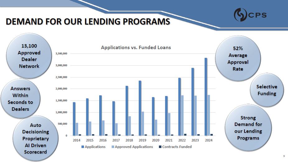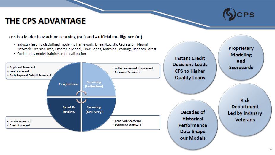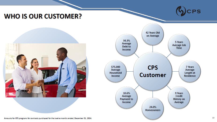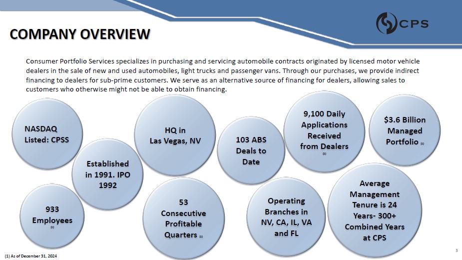 公司概览消费信贷组合服务专门从事购买和服务由持牌机动车辆经销商发起的销售新旧汽车、轻型卡车和载客货车的汽车合同。通过我们的采购,我们为次优质客户向经销商提供间接融资。我们作为经销商的替代融资来源,允许向原本可能无法获得融资的客户进行销售。36亿美元管理投资组合(1)纳斯达克上市:CPSS在拉斯维加斯的CPS总部平均管理任期为24年-300 +年,NV在NV、加利福尼亚州、IL、VA和FL设有运营分支机构933名员工(1)每天从成立于1991年的经销商那里收到9100份申请(1)。IPO1992年53个连续盈利季度(1)迄今103笔ABS成交(1)截至2024年12月31日3