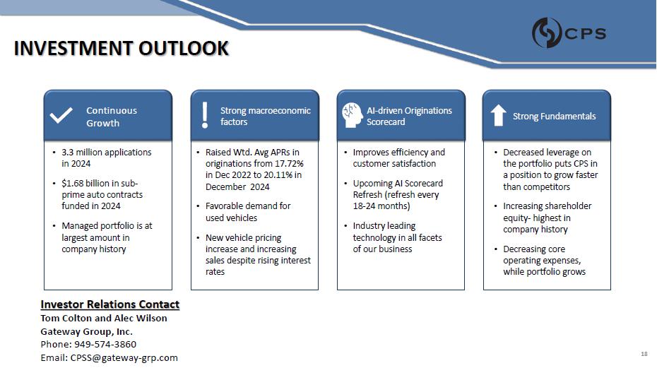 投资前景持续增长强劲的宏观经济因素人工智能驱动的起源记分卡强劲的基本面• 2024年有330万份申请• 2024年资助的16.8亿美元次级汽车合同•管理的投资组合是公司历史上最大的金额•筹集的WTD。来源的平均年利率从2022年12月的17.72%降至2024年12月的20.11% •对二手车的有利需求•尽管利率上升,但新车定价提高和销量增加•提高效率和客户满意度•即将更新的AI记分卡(每18-24个月更新一次)•我们业务各个方面的行业领先技术•投资组合杠杆的降低使CPS能够比竞争对手更快地增长•股东权益增加-公司历史最高•核心运营费用减少,在投资组合增长的同时,投资者关系联系人Tom Colton和Alec Wilson Gateway Group,Inc.电话:949-574-3860电子邮件:CPSS@gateway-grp.com 18