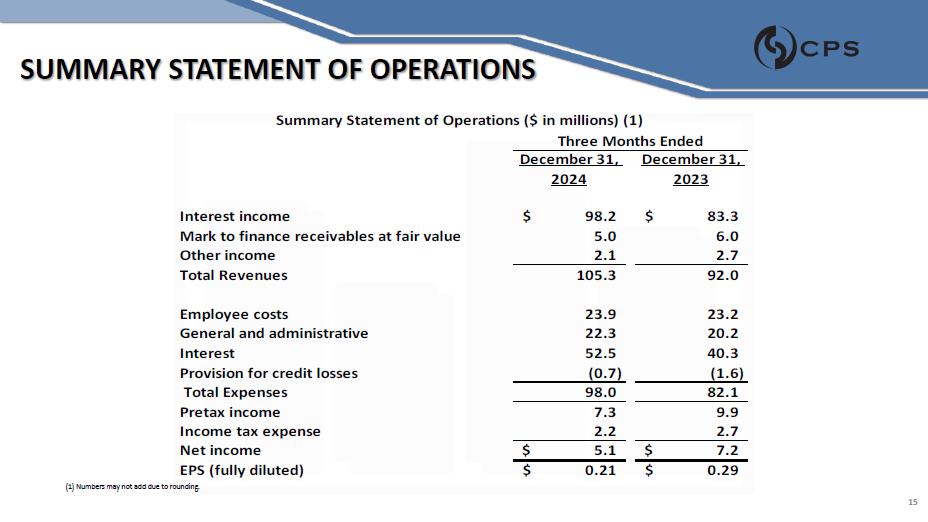 业务概要说明(一)由于四舍五入,数字可能不相加。利息收入按公允价值标记为应收账款融资$ 98.2 $ 83.35.0其他收入2.16.0 2.7总收入105.39 2.0雇员成本23.92 3.2一般和行政22.32 0.2利息52.54 0.3信用损失准备金(0.7)(1.6)总费用98.08 2.1税前收入7.3所得税费用2.29.9 2.7净收入5.1 $ 7.2 $ EPS(完全稀释)0.21 $ 0.29 $运营总表(百万美元)(1)截至2024年12月31日的三个月202315