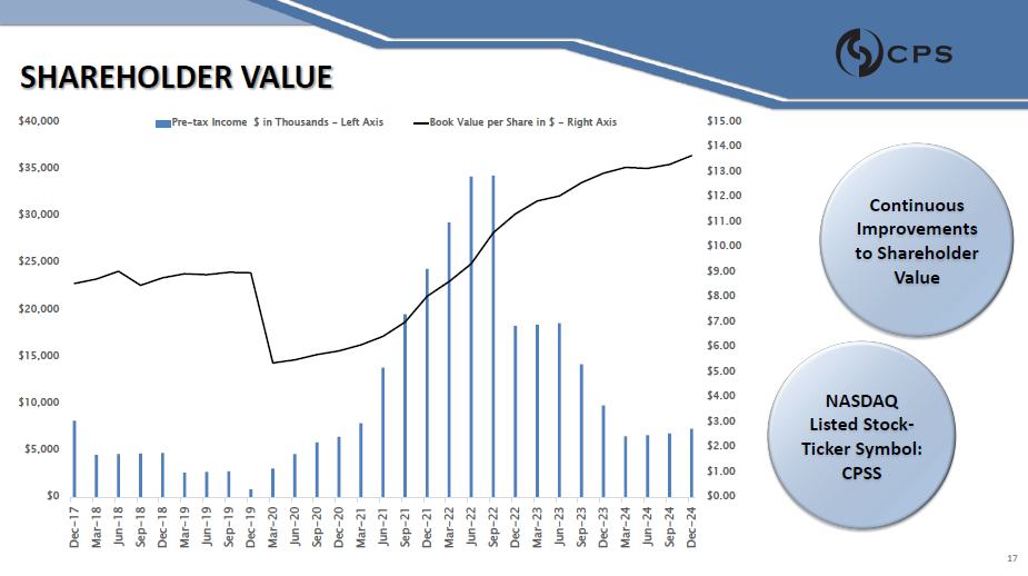 股东价值不断提高股东价值纳斯达克上市股票-股票代码:CPSS $0 $ 5,000 $ 10,000 $ 15,000 $ 20,000 $ 25,000 $ 30,000 $ 35,000 $ 40,000 12月17日-3月17日-6月18日-12月18日-12月18日-3月18日-6月19日-12月19日-12月19日-3月19日-3月20日-6月20日-12月20日-3月20日-3月21日-12月21日-12月21日-3月21日-6月22日-12月22日-3月22日-6月23日-12月23日-3月23日-6月24日-9月24日-12月24日-24日$ 0.00 $ 1.00 $ 2.00 $ 3.00 $ 4.00 $ 5.00 $ 7.00 $ 6.00 $ 8.00 $ 9.00 $ 10.00 $ 11.00 $ 12.00 $ 13.00 $ 14.00 $ 15.00税前收入以千美元计-左轴每股账面价值以美元计-右轴17
