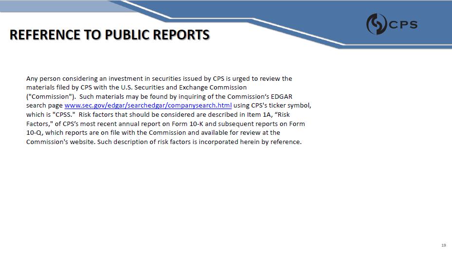 参考公开报告敦促任何考虑投资CPS发行的证券的人审查CPS向美国证券交易委员会(“委员会”)提交的材料。此类材料可通过使用CPS的股票代码“CPSS”查询委员会的EDGAR搜索页面www.sec.gov/edgar/searchedgar/companysearch.html找到。应考虑的风险因素在CPS最近的10-K表格年度报告和随后的10-Q表格报告的项目1a“风险因素”中进行了描述,这些报告已在委员会存档,并可在委员会网站上查阅。这种对风险因素的描述通过引用并入本文。19