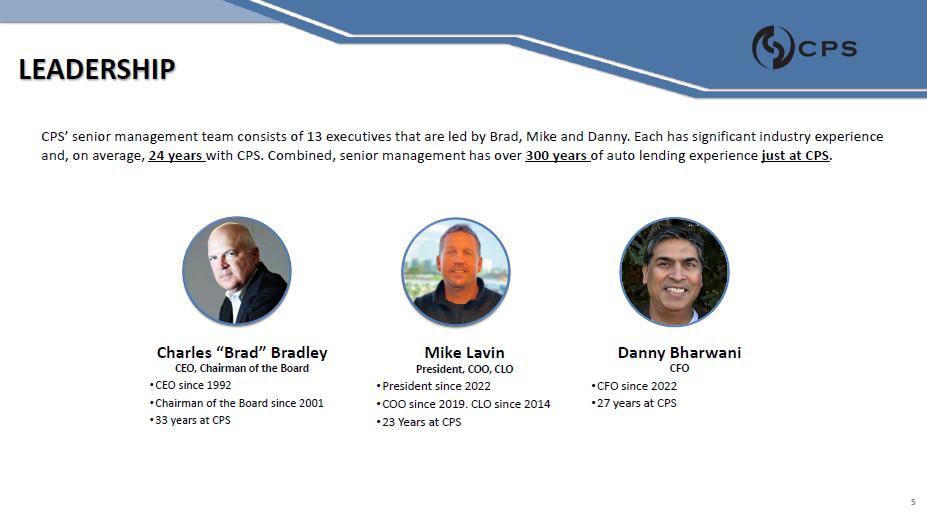 领导层Charles“Brad”Bradley首席执行官、董事会主席•自1992年起担任首席执行官•自2001年起担任董事会主席•在CPS任职33年Mike Lavin总裁、首席运营官、CLO •自2022年起担任总裁•自2019年起担任首席运营官。自2014年起CLO •在CPS任职23年Danny Bharwani CFO •自2022年起担任CFO •在CPS任职27年CPS的高级管理团队由13名高管组成,由Brad、Mike和Danny领导。每个人都有重要的行业经验,平均24年有CPS。综合起来,高级管理层仅在CPS就拥有超过300年的汽车贷款经验。5