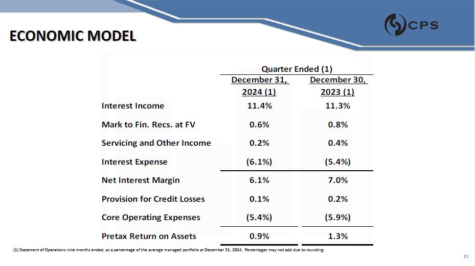 经济模型利息收入2024(1)2023(1)11.4% 11.3% Mark to FIN. Recs. at FV服务和其他收入利息支出净息差信用损失准备金核心经营费用0.6% 0.8% 0.2% 0.4%(6.1%)(5.4%)6.1% 7.0% 0.1% 0.2%(5.4%)(5.9%)截至(1)12月31日止季度,12月30日,税前资产收益率0.9% 1.3%(1)截至九个月的经营报表,占截至2024年12月31日平均管理投资组合的百分比。由于四舍五入,百分比可能不相加。13