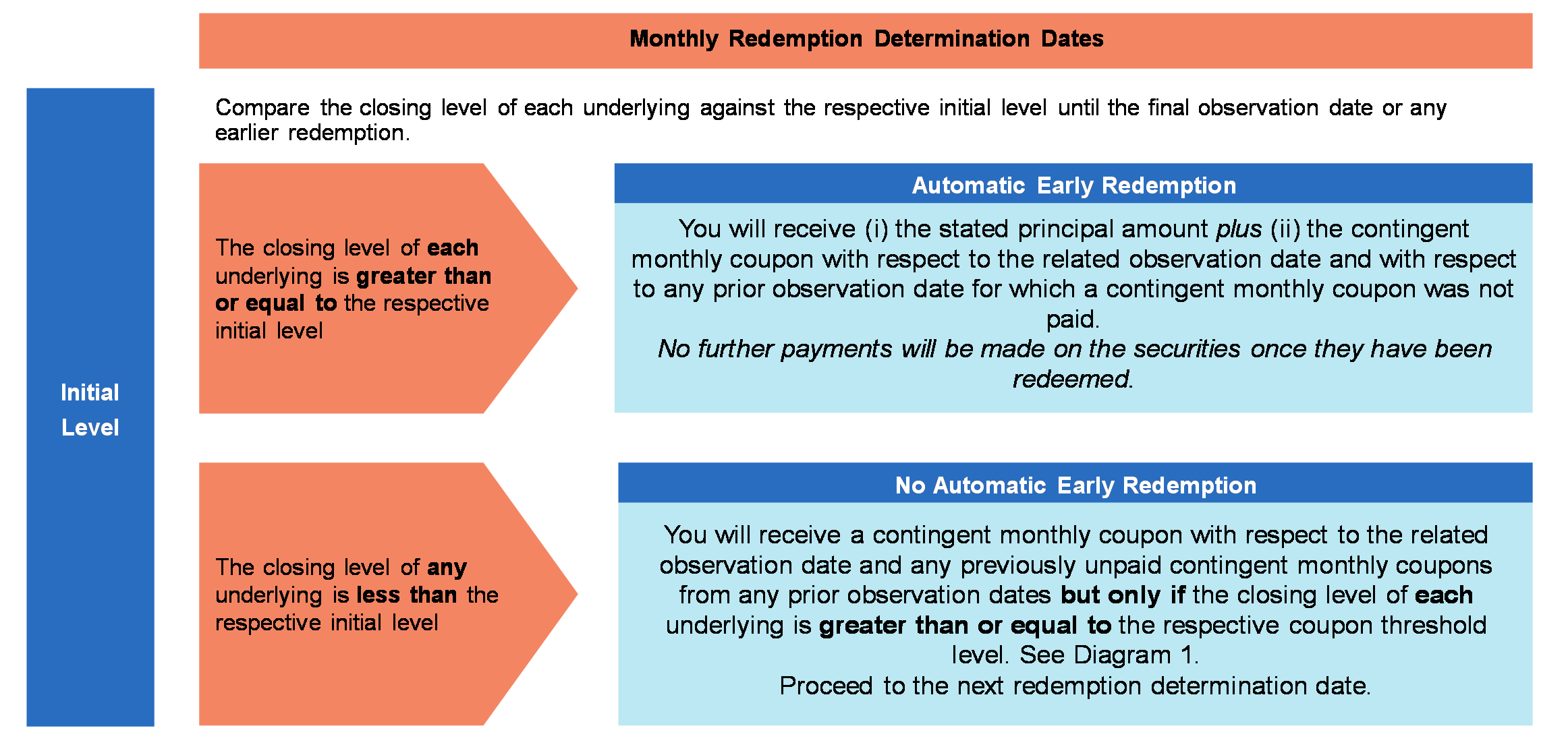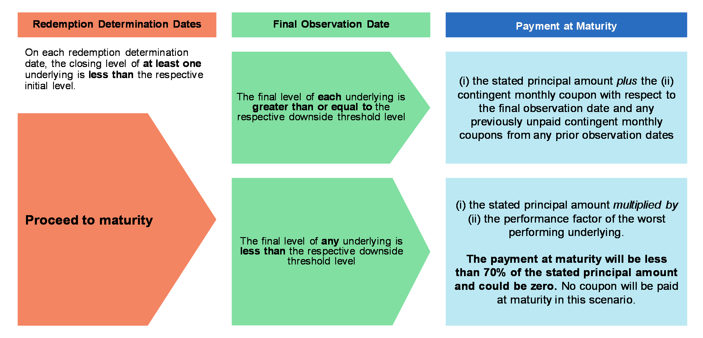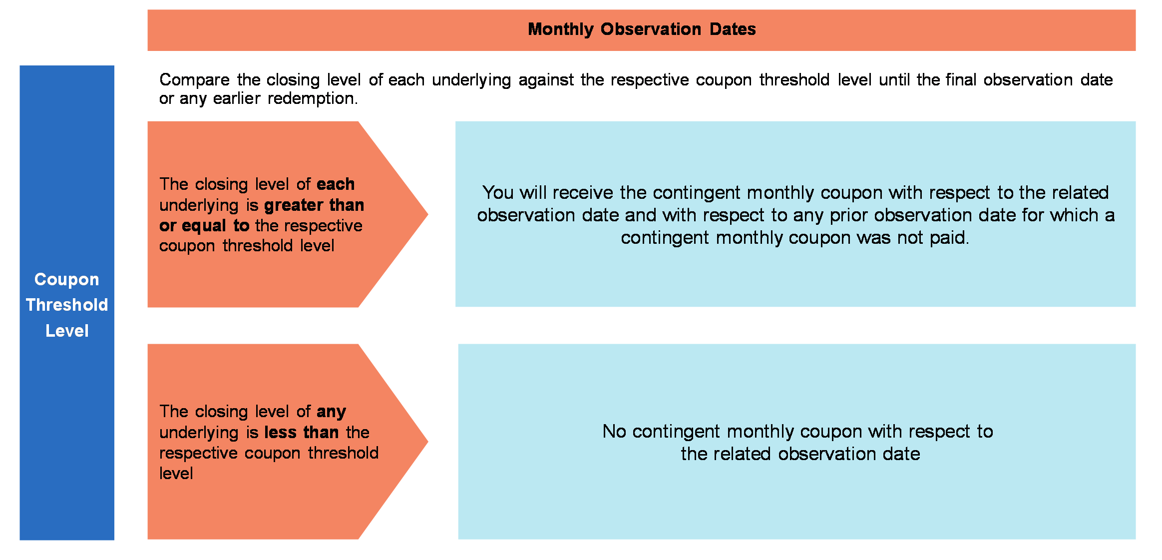 如果每个标的的最终水平大于或等于各自的下行阈值水平,投资者将收到规定的本金金额和与最终观察日相关的或有月息票以及任何先前观察日的任何先前未支付的或有月息票。