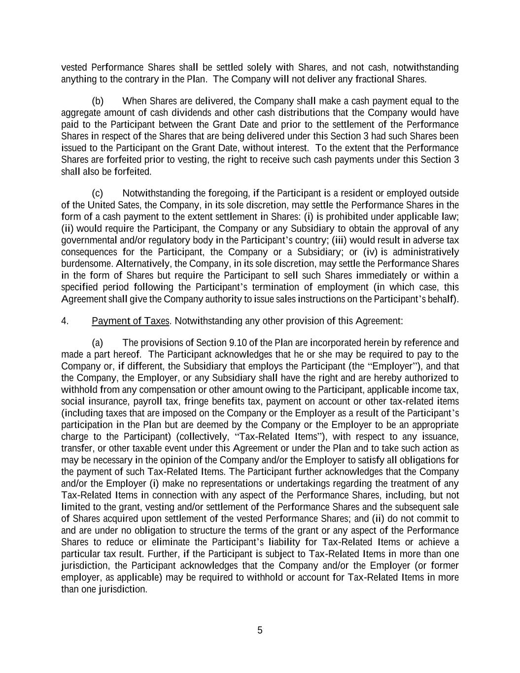 5份既得业绩股份应仅以股份结算,而不是现金结算,尽管计划中有任何相反的规定。公司不会交付任何零碎股份。(b)当股份交付时,公司须作出现金支付,金额相当于公司本应于授予日至根据本第3条交付的股份在授予日向参与者发行的表现股份结算前就该等股份向参与者支付的现金股息及其他现金分派的总额,不计利息。如果履约股份在归属前被没收,则根据本条第3款收取该等现金付款的权利也将被没收。(c)尽管有上述规定,如果参与者是美国境外的居民或受雇人员,公司可全权酌情以现金支付的形式结算业绩股份,但以股份结算的范围为:(i)适用法律禁止;(ii)将要求参与者、公司或任何子公司获得参与者所在国家的任何政府和/或监管机构的批准;(iii)将对参与者、公司或子公司造成不利的税务后果;或(iv)具有行政负担。或者,公司可全权酌情以股份的形式结算履约股份,但要求参与者立即或在参与者终止雇佣后的指定期限内出售该等股份(在这种情况下,本协议应授权公司代表参与者发布销售指示)。4.缴税。尽管本协议有任何其他规定:(a)本计划第9.10节的规定以引用方式并入本文,并成为本协议的一部分。参与者承认,他或她可能被要求向公司或(如果不同)雇用参与者的子公司(“雇主”)付款,并且公司、雇主或任何子公司应有权并在此被授权从欠参与者的任何补偿或其他金额中预扣适用的所得税、社会保险、工资税、附加福利税,记账支付或其他与税收有关的项目(包括因参与者参与计划而对公司或雇主征收但公司或雇主认为是向参与者适当收费的税款)(统称“与税收有关的项目”),就本协议或计划下的任何发行、转让或其他应税事件,并采取公司和/或雇主认为必要的行动,以履行支付此类与税收有关的项目的所有义务。参与者进一步承认,公司和/或雇主(i)没有就与业绩股份的任何方面有关的任何税务相关项目的处理作出任何陈述或承诺,包括但不限于授予,业绩股份的归属和/或结算以及在已归属业绩股份结算时获得的股份的后续出售;(ii)不承诺也没有义务构建授予条款或业绩股份的任何方面,以减少或消除参与者对税务相关项目的责任或实现特定的税务结果。此外,如果参与者在多个司法管辖区受制于与税务相关的项目,则参与者承认,公司和/或雇主(或前雇主,如适用)可能被要求在多个司法管辖区扣留或核算与税务相关的项目。