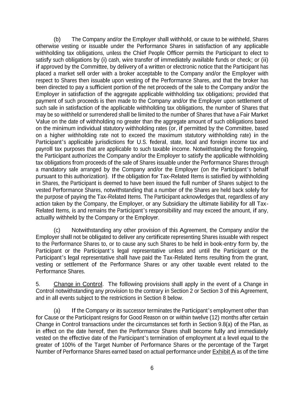 6(b)公司和/或雇主应扣留或促使扣留根据履约股份以其他方式归属或可发行的股份,以清偿任何适用的预扣税义务,除非首席人事官允许参与者选择通过(i)现金、电汇即时可用资金或支票来履行此类义务;或(ii)如果委员会批准,通过交付书面或电子通知,表明参与者已就业绩股份归属时可发行的股份向公司和/或雇主可接受的经纪人下达市场卖出订单,且已指示经纪人向公司和/或雇主支付足够部分的出售净收益,以清偿适用的预扣税义务总额;但该等收益随后在此类出售结算时向公司和/或雇主支付,以清偿适用的预扣税义务,可以如此代扣代缴或交还的股份数量应限于在代扣代缴之日具有公允市场价值的股份数量,该数量不超过参与者在适用于此类应税收入的美国联邦、州、地方和外国所得税和工资税目的的适用司法管辖区中基于最低个人法定代扣代缴税率(或在委员会允许的情况下,基于不超过最高法定代扣代缴税率的较高代扣代缴税率)的此类债务总额。尽管有上述规定,参与者授权公司和/或雇主通过公司和/或雇主(根据本授权代表参与者)安排的强制性出售,从根据履约股份发行的股份的出售收益中履行适用的预扣税义务。如果通过代扣代缴股份来履行与税务相关的项目的义务,则参与者被视为已获得全部数量的受既得业绩股份约束的股份,尽管若干股份仅为支付与税务相关的项目而被扣留。参与者承认,无论公司、雇主或任何子公司采取任何行动,所有与税务相关的项目的最终责任现在是并将继续是参与者的责任,并且可能超过公司或雇主实际扣留的金额(如果有的话)。(c)尽管有本协议的任何其他规定,公司和/或雇主没有义务向参与者或参与者的法定代表人交付任何代表就履约股份可发行的股份的证书,或促使参与者或参与者的法定代表人以记账式形式持有任何此类股份,除非且直至参与者或参与者的法定代表人已支付因履约股份的授予、归属或结算或与履约股份相关的任何其他应税事件而产生的与税收相关的项目。5.控制权变更。尽管本协议第2节或第3节有任何相反规定,但在控制权发生变更的情况下,以及在受以下第8节限制的所有情况下,应适用以下规定。(a)如公司或其继任人在计划第9.8(a)条所列情况下的控制权交易的某些变更后十二(12)个月或之后十二(12)个月内非因故终止该参与者的雇用或该参与者因良好理由辞职,则于本计划日期生效,然后,绩效股份应于参与者终止雇佣生效之日起全部且立即归属,其水平等于绩效股份目标数量的100%或根据截至当时的附件 A下的实际表现所赚取的绩效股份目标数量的百分比中的较高者
