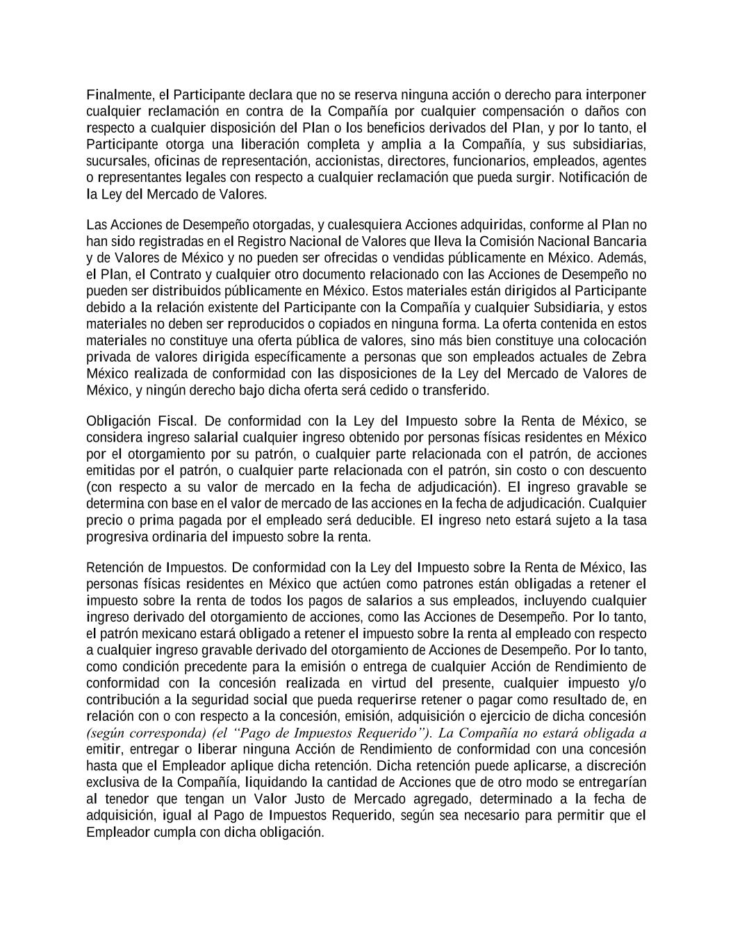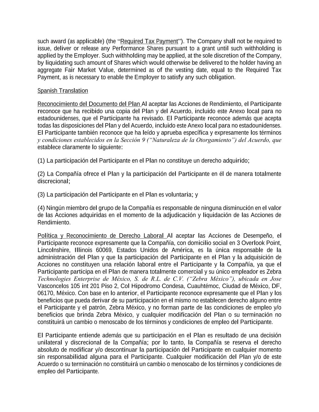 此类裁决(如适用)(“所需的税款支付”)。在雇主申请预扣之前,公司不得被要求根据授予发行、交付或解除任何绩效股份。可由公司全权酌情适用此种预扣税,方法是清算本应交付给持有人的股份数量,这些股份的总公允市场价值在归属日期确定,等于所需的税款,这是使雇主能够履行任何此类义务所必需的。西班牙文翻译Reconocimiento del documento del plan Al aceptar las acciones de rendimiento,el Participante recococe que ha recibido una copia del Plan y del acuerdo,incluido este Anexo local para no estadounidenses,que el Participante ha revisado。El Participante recoce adem á s que acepta todas las disposiciones del Plan y del Acuerdo,incluido este Anexo local para no estadounidenses。The Participante tambi é n reconoce que ha le í do y aprueba espec í fica y expressamente los t é rminos y condiciones established en la Secci ó n 9(“Naturaleza de la Otorgamiento”)del Acuerdo,其中明确规定了以下内容:(1)参与者对计划的参与不构成所获得的权利;(2)公司完全酌情提供计划和参与者对计划的参与;(3)参与者对计划的参与是自愿的;(4)公司集团的任何成员对在业绩承诺的裁决和清算时所获得的行动的价值没有任何减少负责。Politica y Reconocimiento de Derecho Laboral Al aceptar las Acciones de Desempe ñ o,el Participante recoce expressamente que la Compa ñ í a,with domicilio social en 3 Overlook Point,Lincolnshire,Illinois 60069,Estados Unidos de Am é rica,es la ú nica responsable de la administraci ó n del Plan y que la participaci ó n del Participante en el Plan y la acquisici ó n de Acciones no constitution una relaci ó n laboral entre el Participante y la Compa ñ í a,ya queubicada en Jose Vasconcelos 105 int 201 Piso 2,Col Hipodromo Condesa,Cuauht é moc,Ciudad de M é xico,DF,06170,M é xico。根据上述情况,参与者明确承认,该计划及其参与可能带来的好处不会在参与者和雇主Zebra M é xico之间建立任何权利,也不构成Zebra M é xico提供的就业条件和/或好处的一部分,该计划或其结束的任何修改都不会构成参与者就业条款和条件的变更或变更。The Participante also understands that su participaci ó n in the Plan is resultado de una decision sunarily and discricional de la Compa ñ í a;por lo tanto,the Compa ñ í a se reserva el right absoluto de modificar y/o descinuar la participaci ó n del Participante in cualquier momento sinsin responsabilidad alguna para the Participante。Cualquier modificaci ó n del Plan y/o de este acuerdo o su terminaci ó n no constituir á un cambio o menoscabo de los t é rminos y condiciones de empleo del Participante。